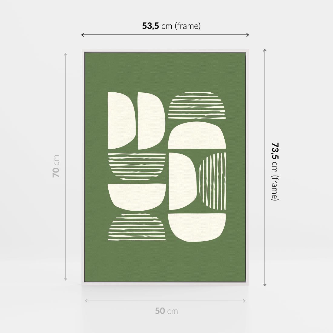 Ten plakat łączy geometryczne boho kształty z minimalistycznym podejściem, umieszczając je na głębokim oliwkowym tle. Przez zastosowanie minimalizmu, sztuka ta wydobywa esencję geometrii i stylu boho, tworząc spokojny i wyjątkowy element dekoracyjny, który wprowadza zieleń natury do Twojej przestrzeni.