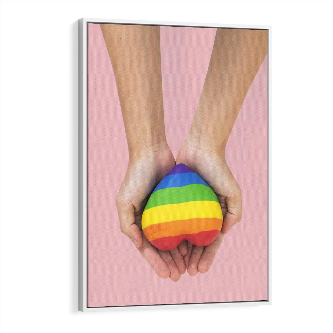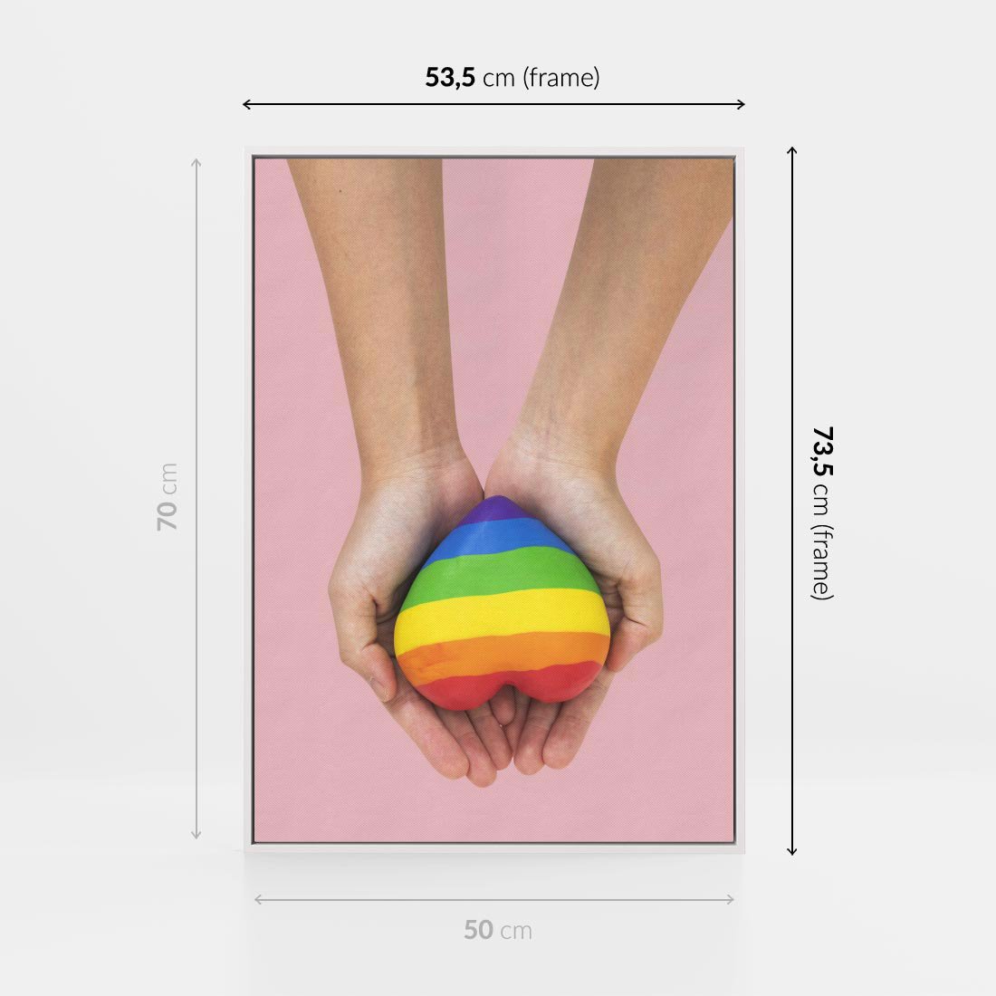 Obraz w ramie 50x70 - Miłość na Dłoniach - zdjęcie, dłonie trzymają ulepione tęczowe serce - rama biała