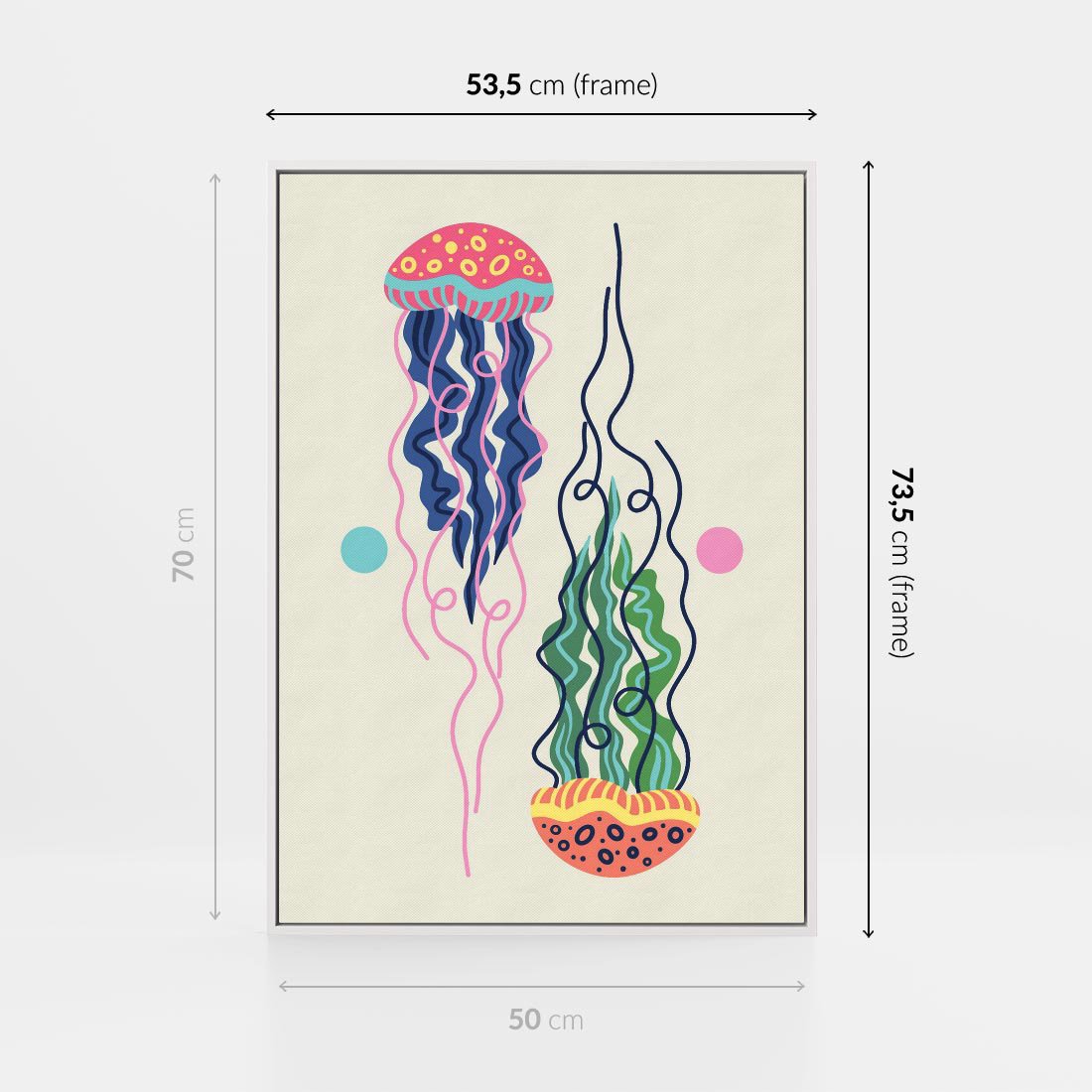 Obraz w ramie 50x70 - Morskie Pulsacje - nowoczesny optymistyczny plakat, kolorowe meduzy - rama biała
