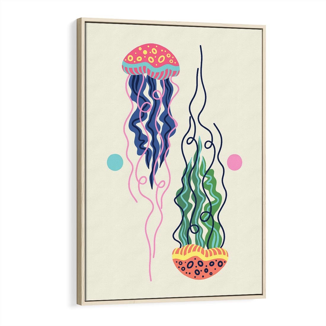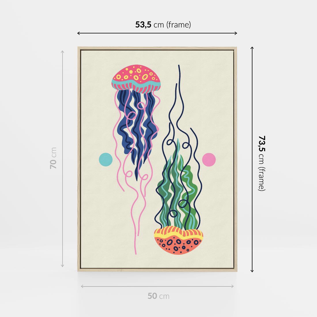 Obraz w ramie 50x70 - Morskie Pulsacje - nowoczesny optymistyczny plakat, kolorowe meduzy - rama drewno