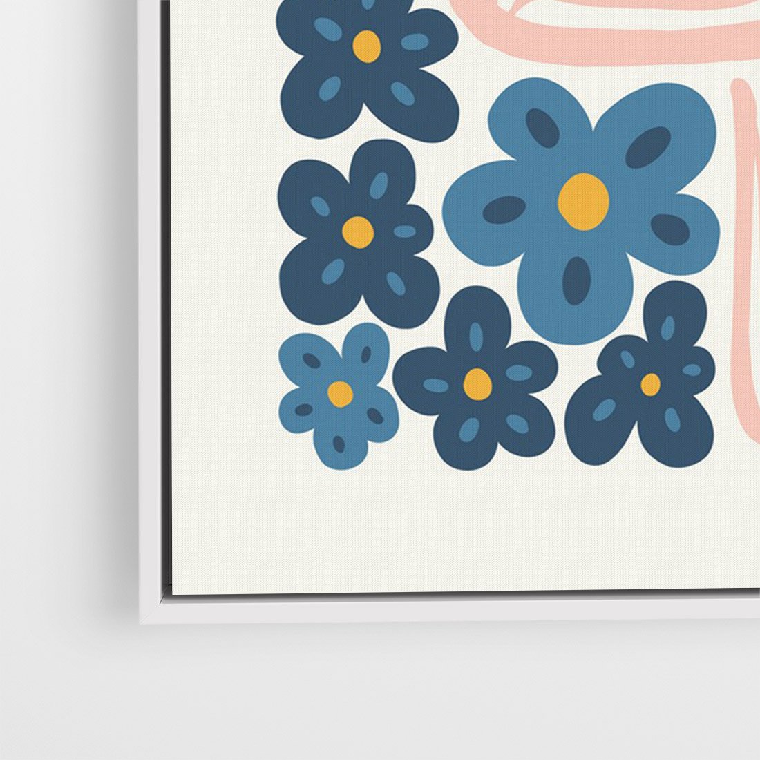 Ta nowoczesna abstrakcja łączy niebieskie kwiaty niezapominajki z delikatnymi pastelowymi odcieniami. Kompozycja zachęca do kontemplacji, wprowadzając spokój i harmonię do wnętrza.