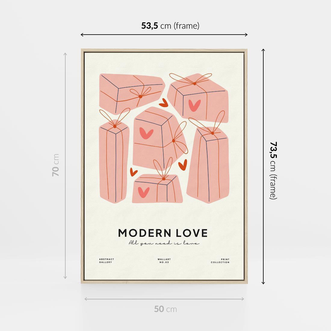 Ta nowoczesna grafika w pastelowych odcieniach ukazuje serduszka i prezenty, tworząc dynamiczną kompozycję. Nowoczesna Miłość to hołd dla uczucia w stylu współczesnym, z subtelną typografią Modern Love. Obraz ten wniesie do wnętrza dawkę radości i romantyzmu, jednocześnie podkreślając nowoczesny charakter miłości.