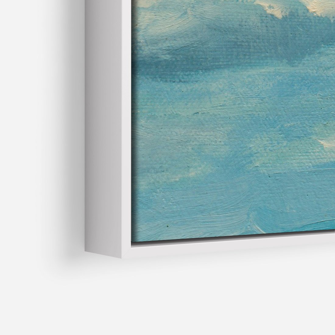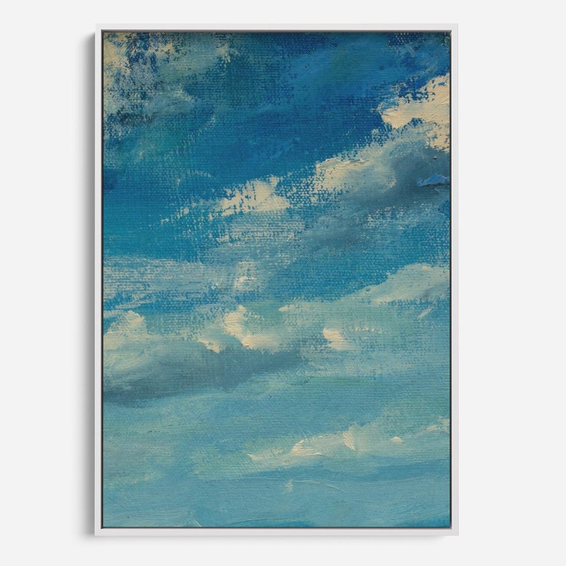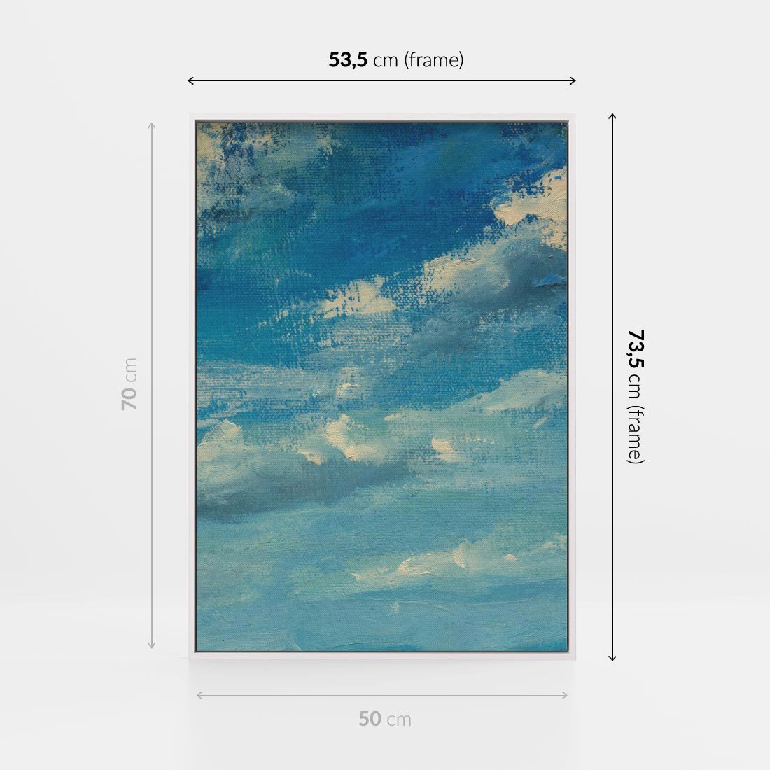 Obraz w ramie 50x70 - Oddechy niebiańskiej materii - olejny obraz, smugi farby przypominają obłoki na błękitnym niebie - rama biała
