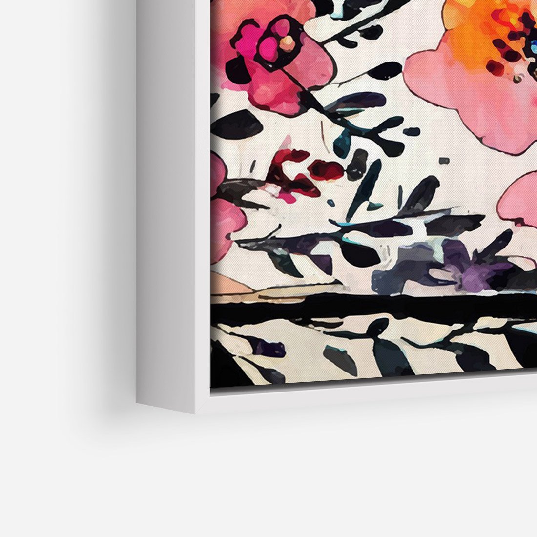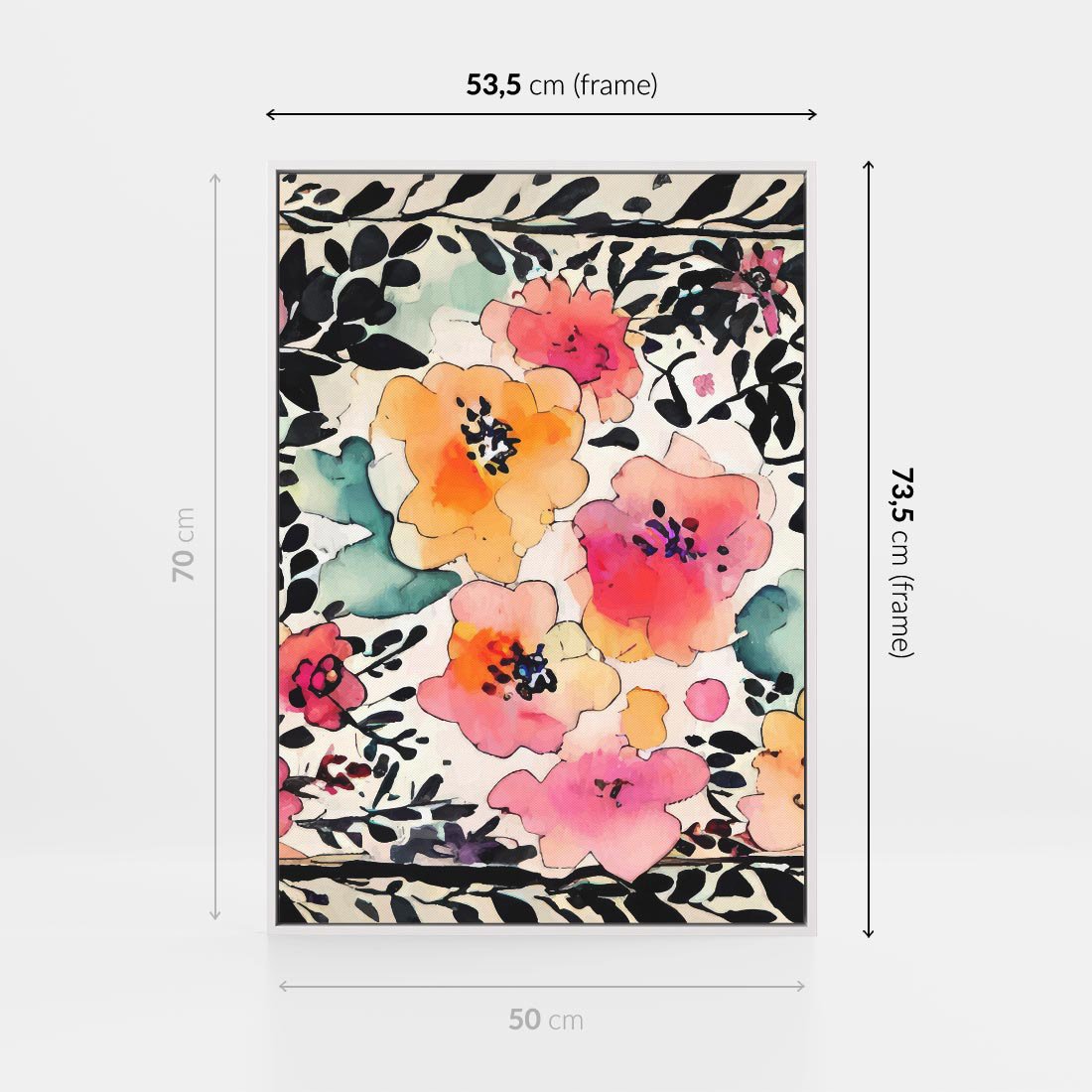 Obraz w ramie 50x70 - Opowieść w kroplach farb - akwarelowe kwiaty, mocna ornamentowa czarna ramka namalowana dookoła obrazu - rama biała