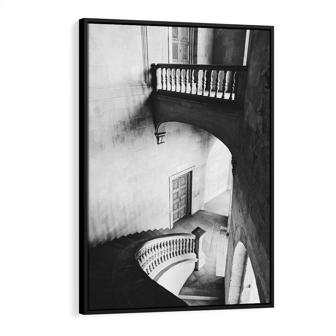 Obraz w ramie 50x70 - Po Schodach w Dół - czarno białą fotgrafia, zakręcone schody w starek kamienicy - rama czarna