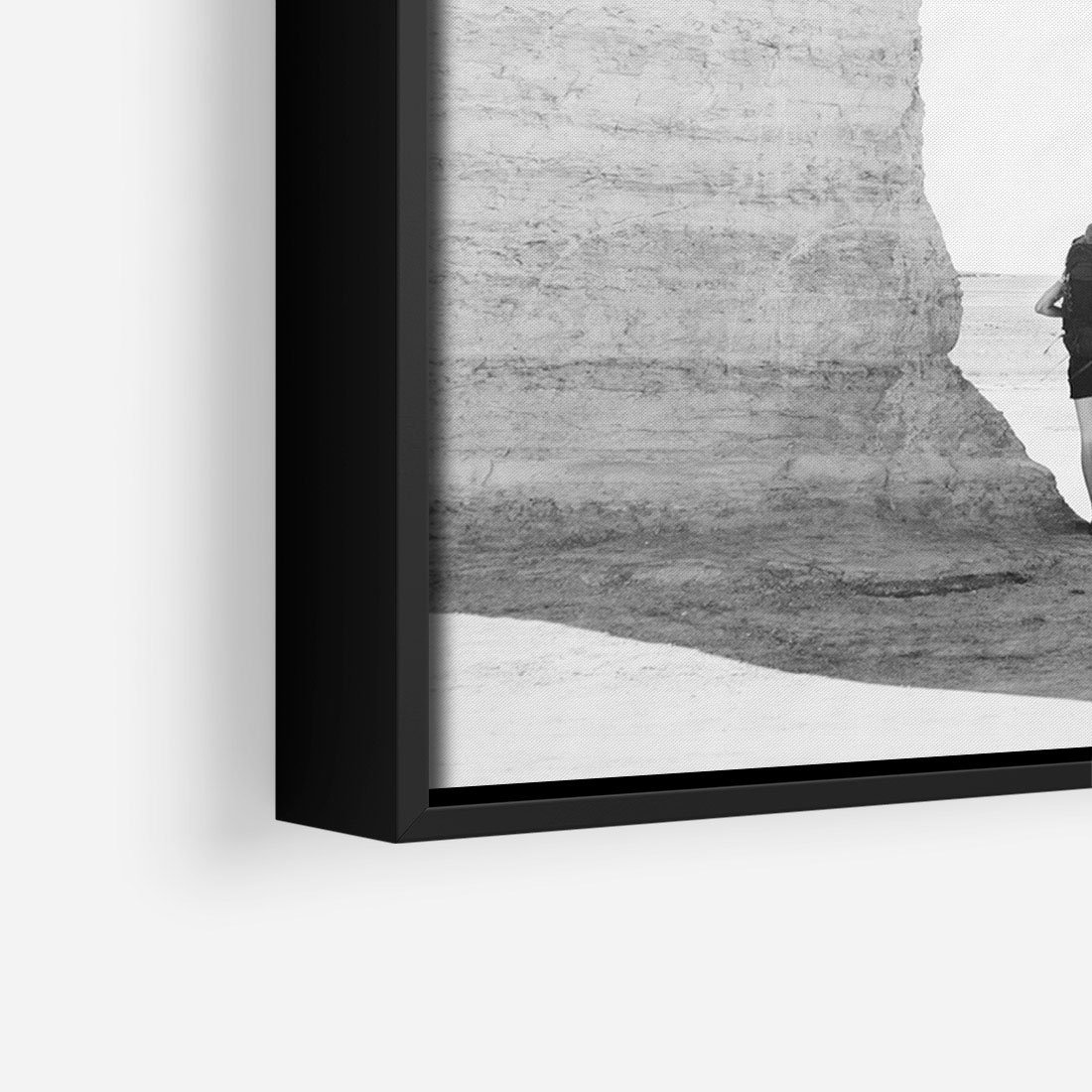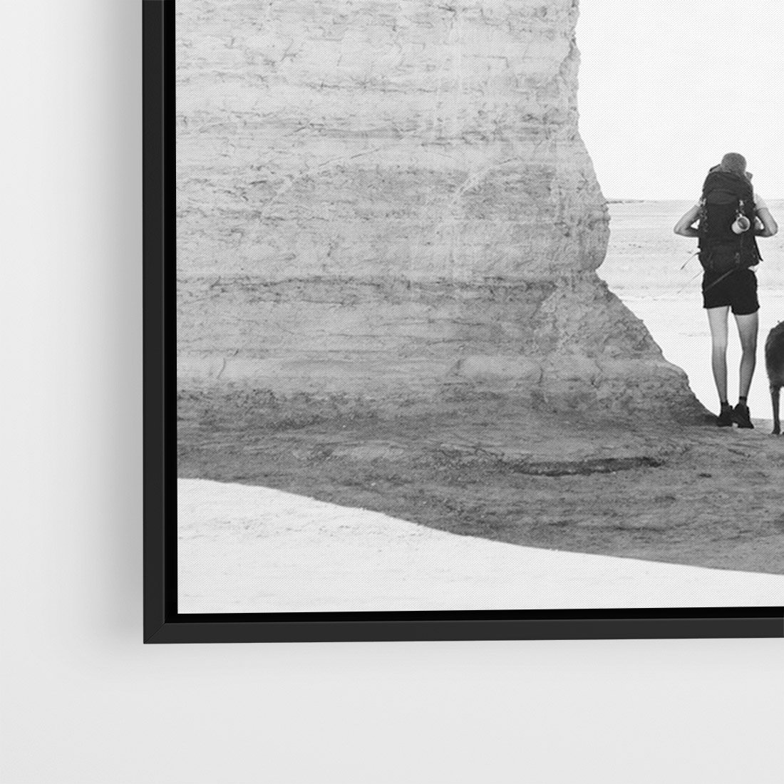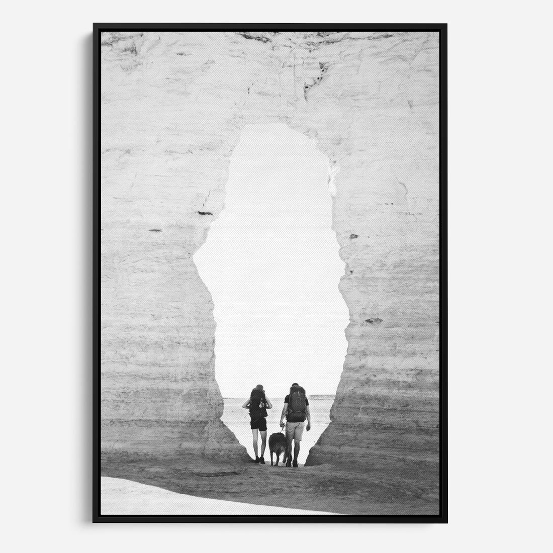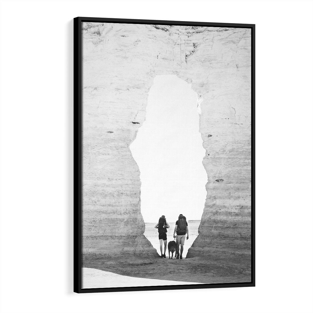 Ta czarno-biała fotografia przedstawia dwójkę podróżników, którzy eksplorują skaliste wybrzeże z psem na smyczy. W oddali rozciąga się widok na morze, tworząc malowniczą scenerię. Fotografia ta odzwierciedla ducha przygody i wspólnej podróży oraz piękno przyrody. Czarno-biała paleta kolorów nadaje zdjęciu klasyczny i nostalgiczny charakter, podkreślając jednocześnie atmosferę i emocje chwili. To doskonały element dekoracyjny do wnętrz, które cenią sobie podróżniczy duch i piękno przyrody.
