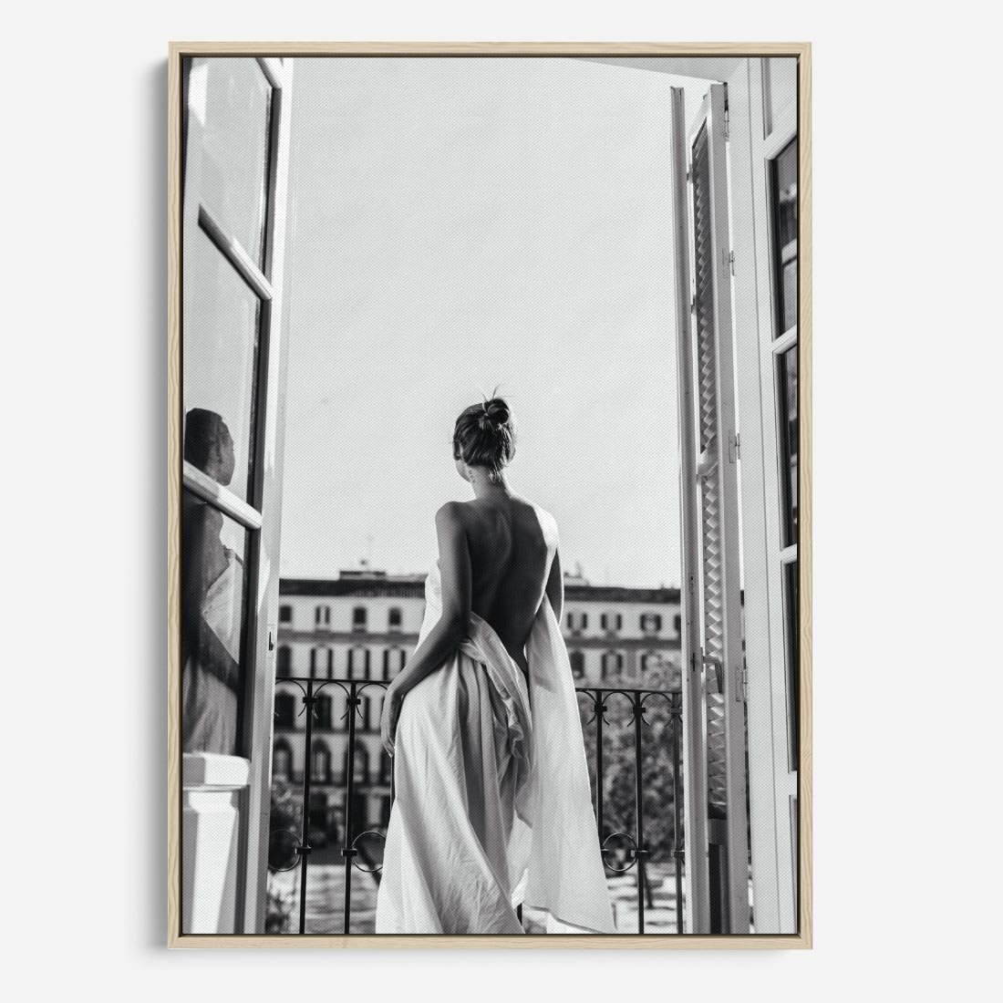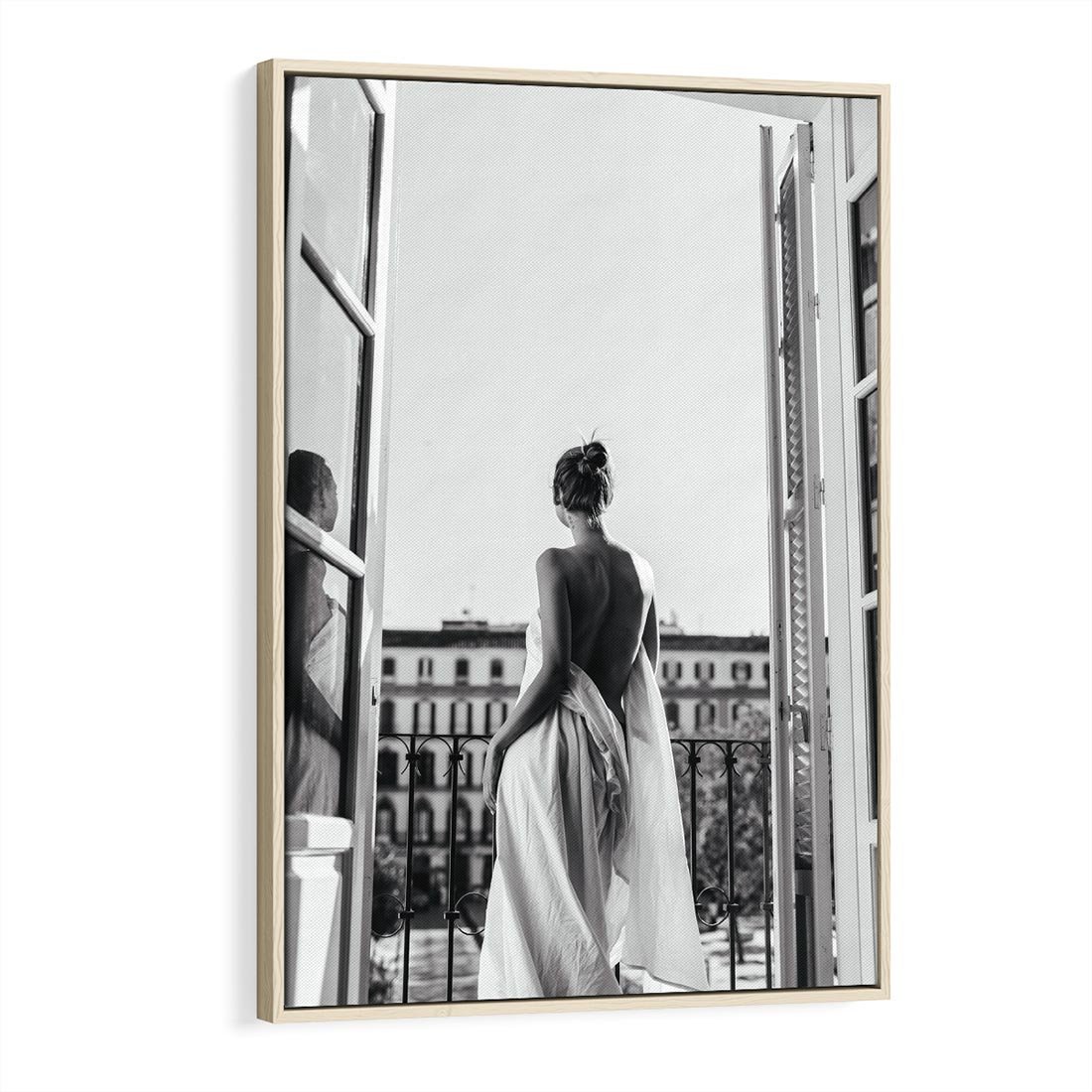 Obraz w ramie 50x70 - Poranki w Paryżu - czarno białe zdjęcie, kobieta w prześcieradle na balkonie - rama drewno