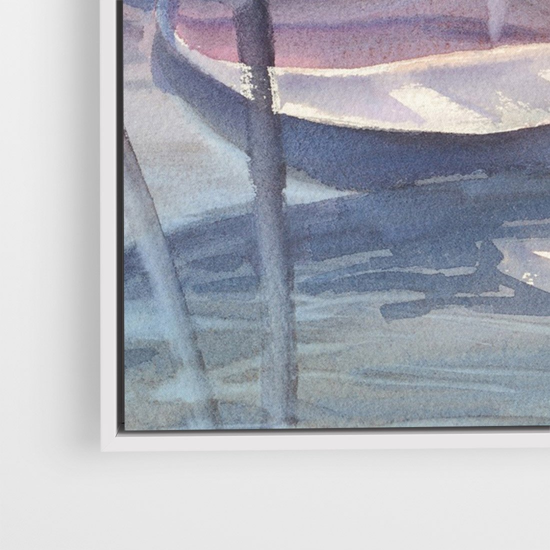 Ten akwarelowy rysunek przedstawia malownicze gondole na tle weneckiego kanału podczas zachodu słońca. Stonowane pastelowe kolory tworzą romantyczną aurę, podkreślając urok i magię Wenecji. To wizja spokoju i piękna, która przenosi nas w magiczny świat włoskiej laguny i zaprasza do kontemplacji nad pięknem przyrody i architektury.