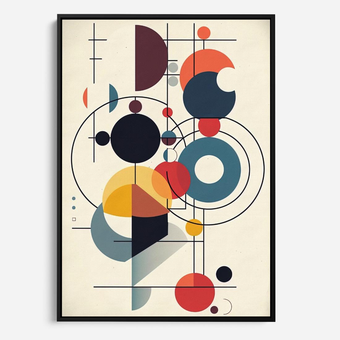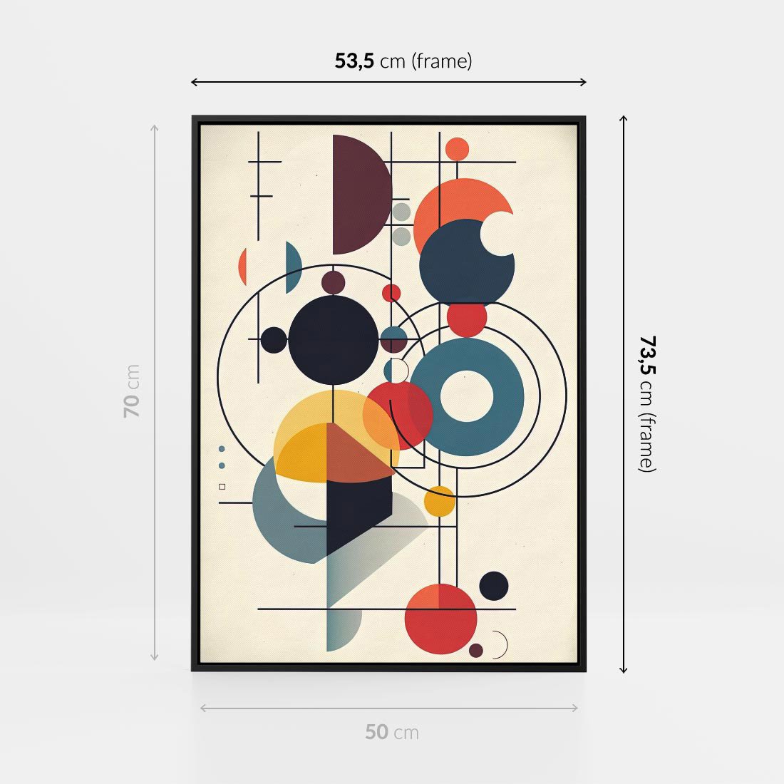 Ta abstrakcyjna geometryczna kompozycja jest zbudowana z precyzyjnych kształtów, takich jak koła i linie. Tworzą one harmonijną równowagę pomiędzy formami, tworząc interesującą wizualną podróż dla oglądającego.