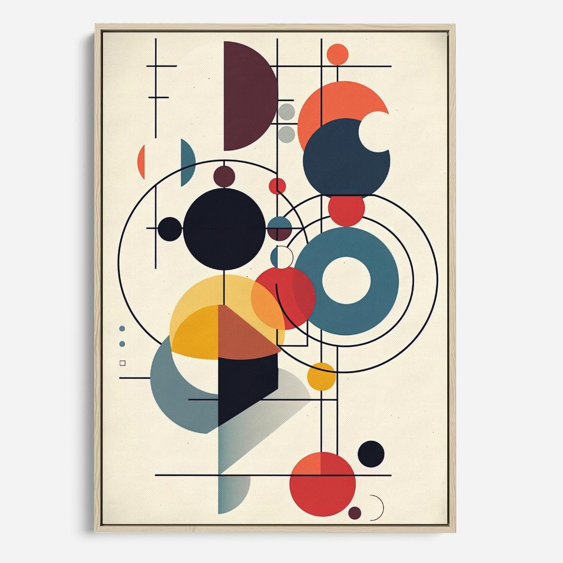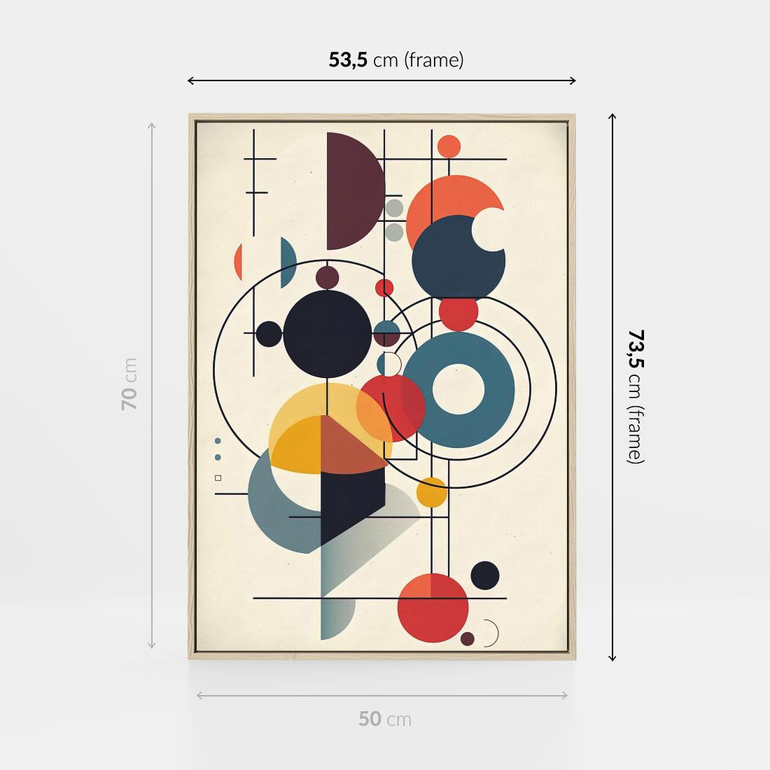 Ta abstrakcyjna geometryczna kompozycja jest zbudowana z precyzyjnych kształtów, takich jak koła i linie. Tworzą one harmonijną równowagę pomiędzy formami, tworząc interesującą wizualną podróż dla oglądającego.