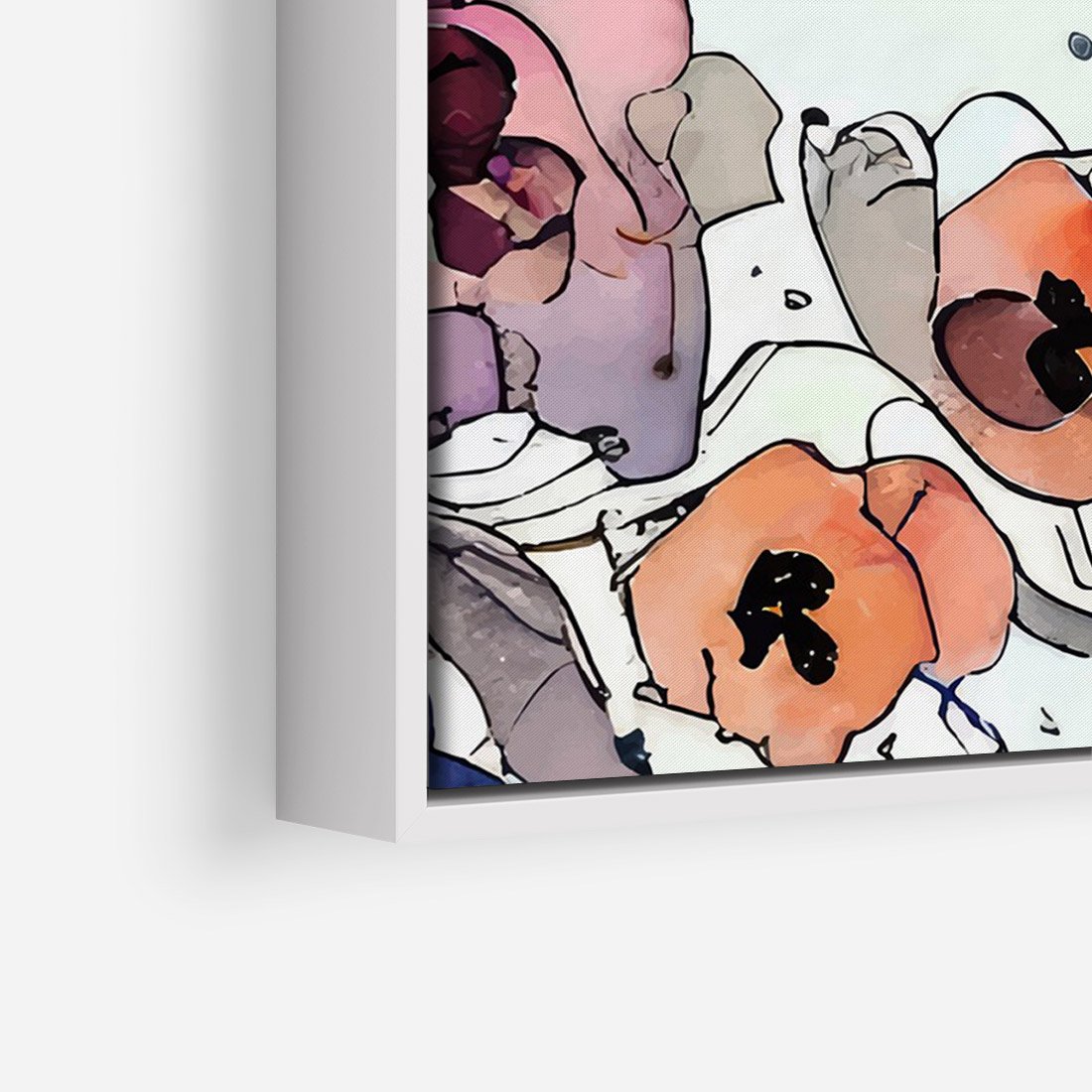 Ten obraz przypomina witrażowe kompozycje, gdzie akwarelowe kwiaty ożywają w intensywnych kolorach. Czarne kontury wydobywają ich piękno i nadają im wyrazistość. To połączenie kunsztu witrażowego z subtelnością kwiatowych motywów tworzy niepowtarzalną wizję natury.
