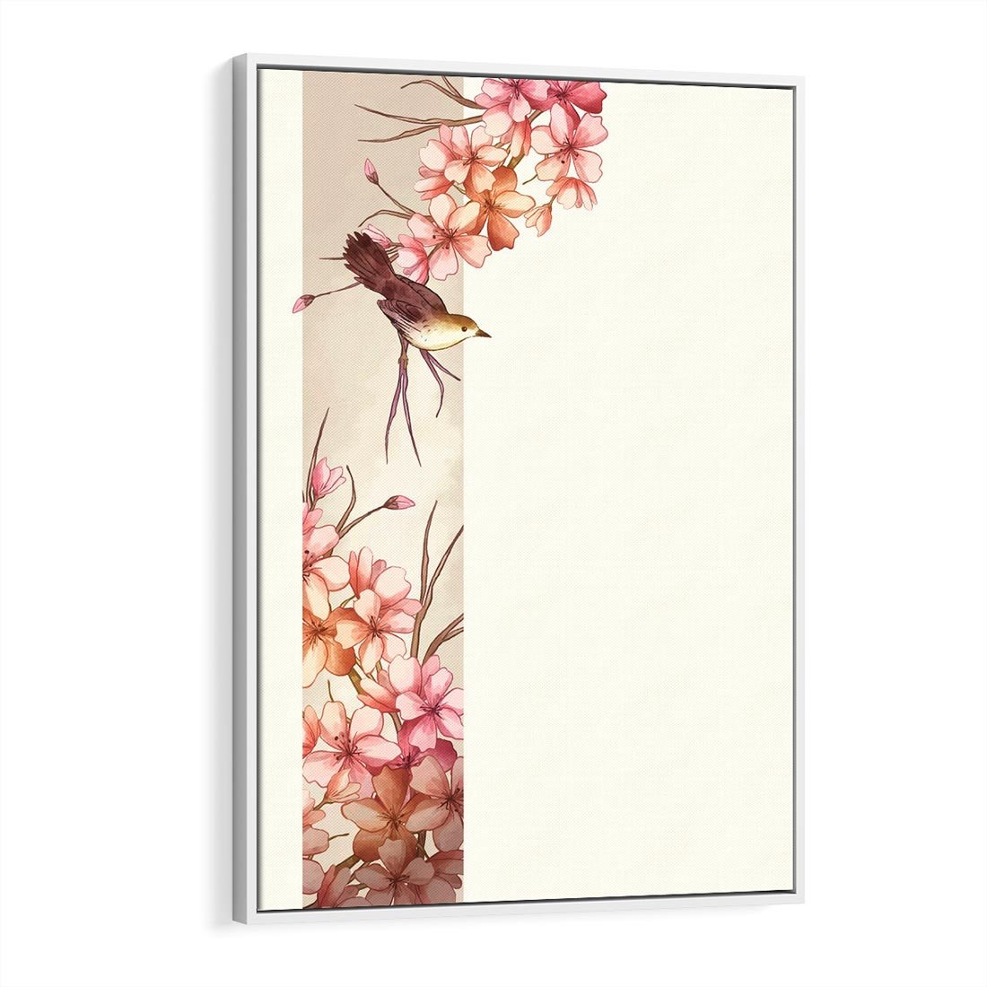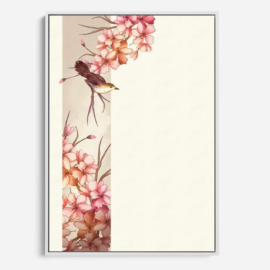 Japońska sztuka spotyka się z naturą w harmonii. Ptak i kwiat wiśni tworzą pejzaż inspirujący Japandi - połączenie spokoju i prostoty.