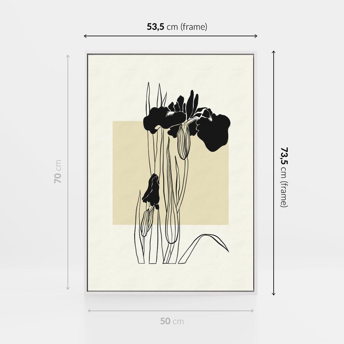 Uchwycenie piękna irysów w minimalistycznej grafice. Czarne kontury tworzą elegancką formę, a beżowe akcenty dodają delikatności. Ten obraz to idealny wybór dla miłośników minimalizmu, pragnących wprowadzić subtelny akcent natury do swojego wnętrza.