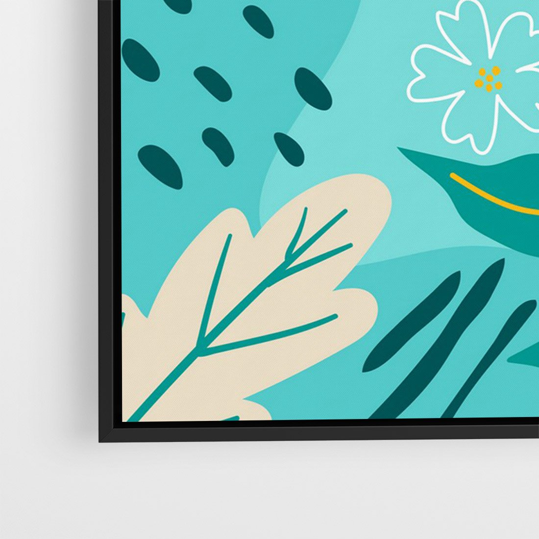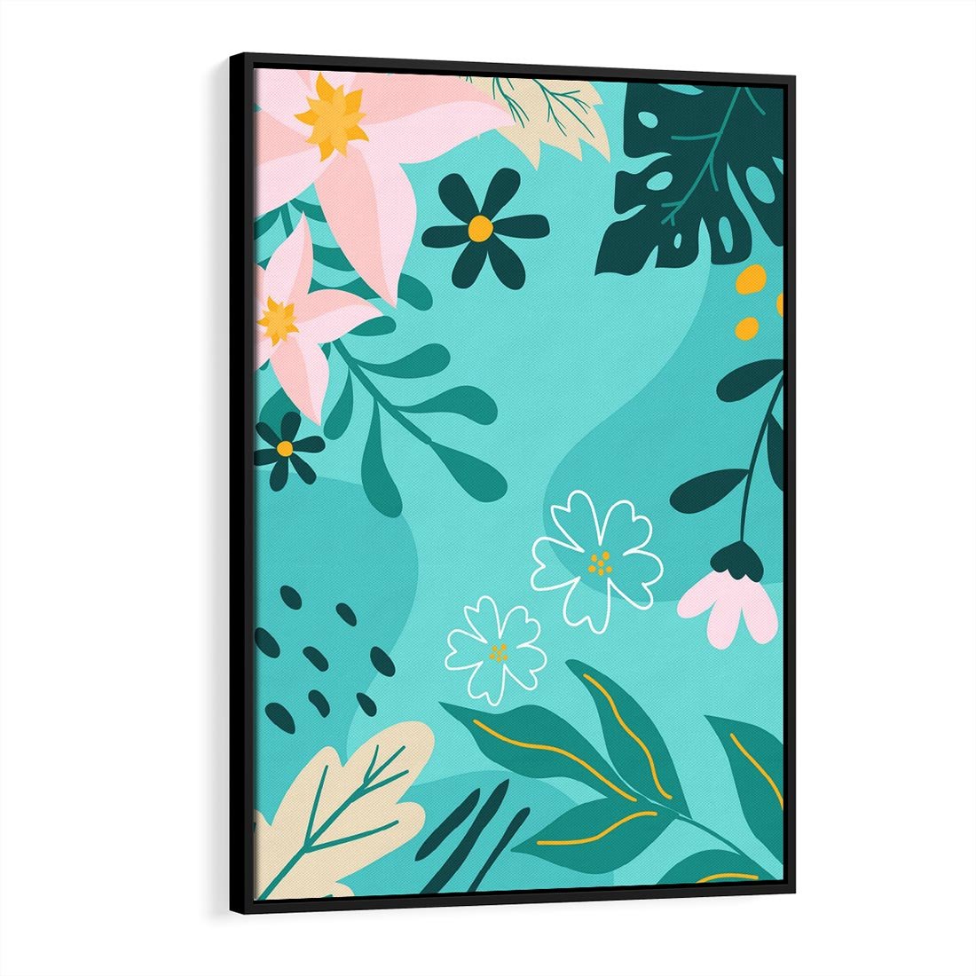 Pastelowa kompozycja ożywiona tropikalnymi kwiatami i liśćmi. Delikatne odcienie turkusu i różu tworzą wizualne radosne piękno, przywołując atmosferę egzotycznej harmonii.