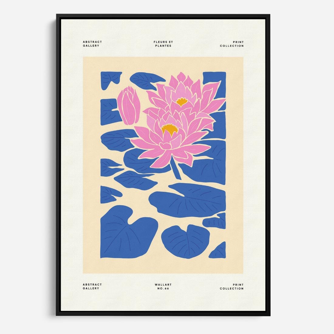 Ten nowoczesny plakat ukazuje pastelowe lilie wodne w odcieniach błękitu i różu, tworząc spokojny i oniryczny obraz. Sztuka ta jest idealnym dodatkiem do sypialni, tworząc atmosferę sennej harmonii i piękna natury.