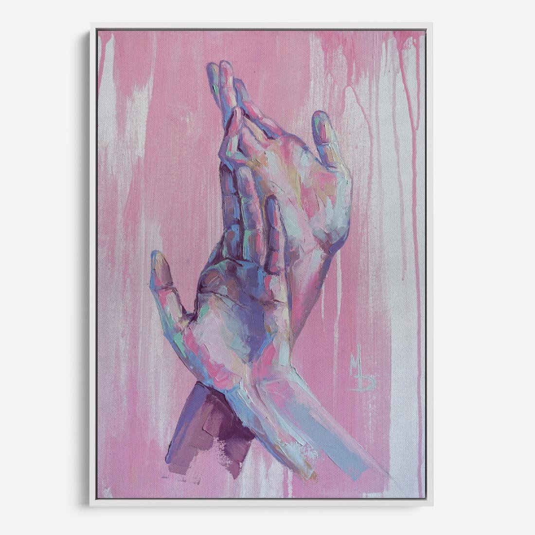 Ten nowoczesny obraz olejny w pastelowych kolorach prezentuje splecione dłonie jako główny motyw. Delikatne odcienie pasteli nadają mu subtelności i spokoju, tworząc jednocześnie abstrakcyjną i znaczącą kompozycję. To dzieło sztuki emanuje harmonią i jednością, symbolizującą współpracę, miłość lub zrozumienie między ludźmi. Idealnie pasuje do wnętrz o nowoczesnym designie, które cenią sobie sztukę jako wyraz emocji i relacji.