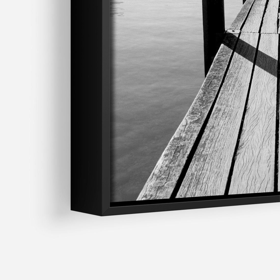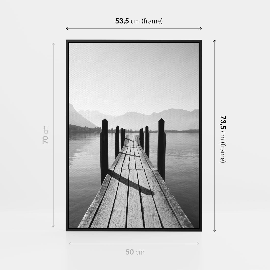 Obraz w ramie 50x70 - Spokojna Przystań - czarno biała fotografia, drewniany pomost na jeziorze - rama czarna