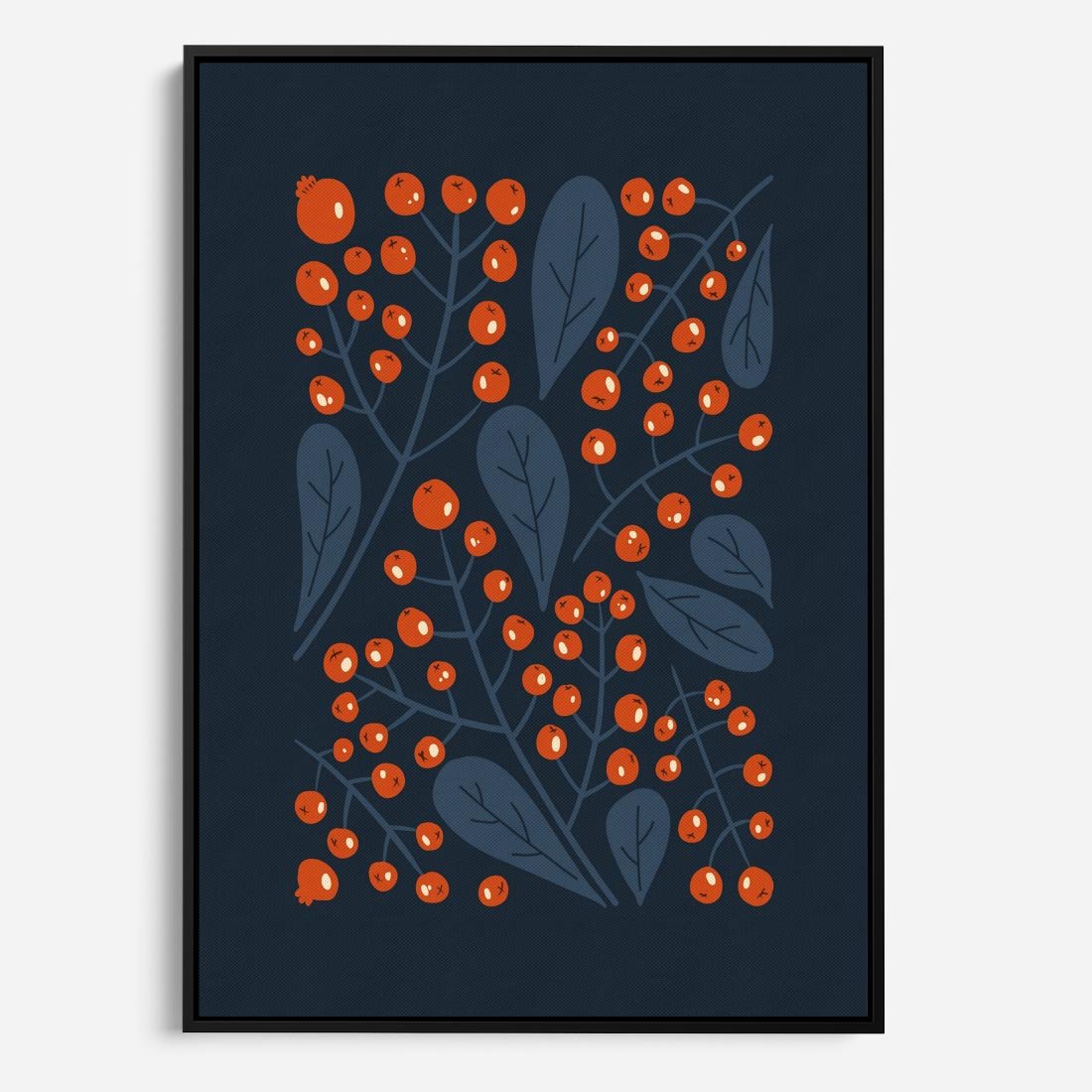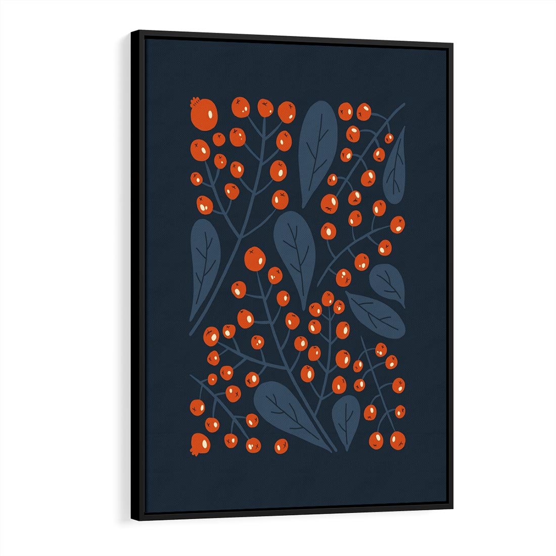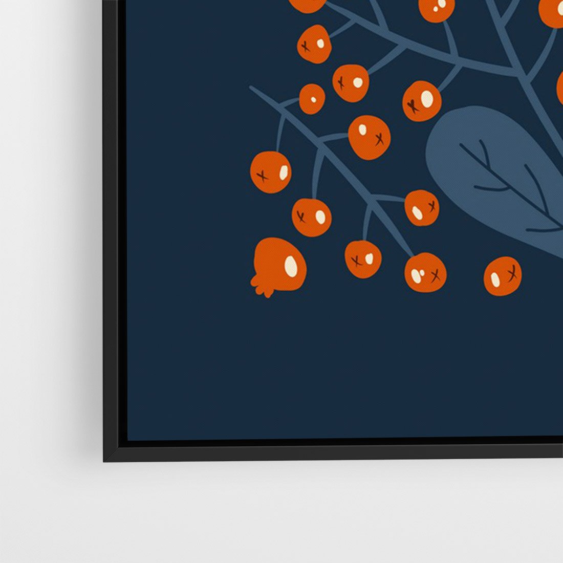 Na granatowym tle wyraziste pomarańczowe owoce jarzębiny tworzą dynamiczną roślinną kompozycję. To harmonijne połączenie barw, które oddaje piękno i zróżnicowanie natury. To obraz, który przykuwa uwagę i wyróżnia się oryginalnym zestawieniem kolorów i form roślinnych.