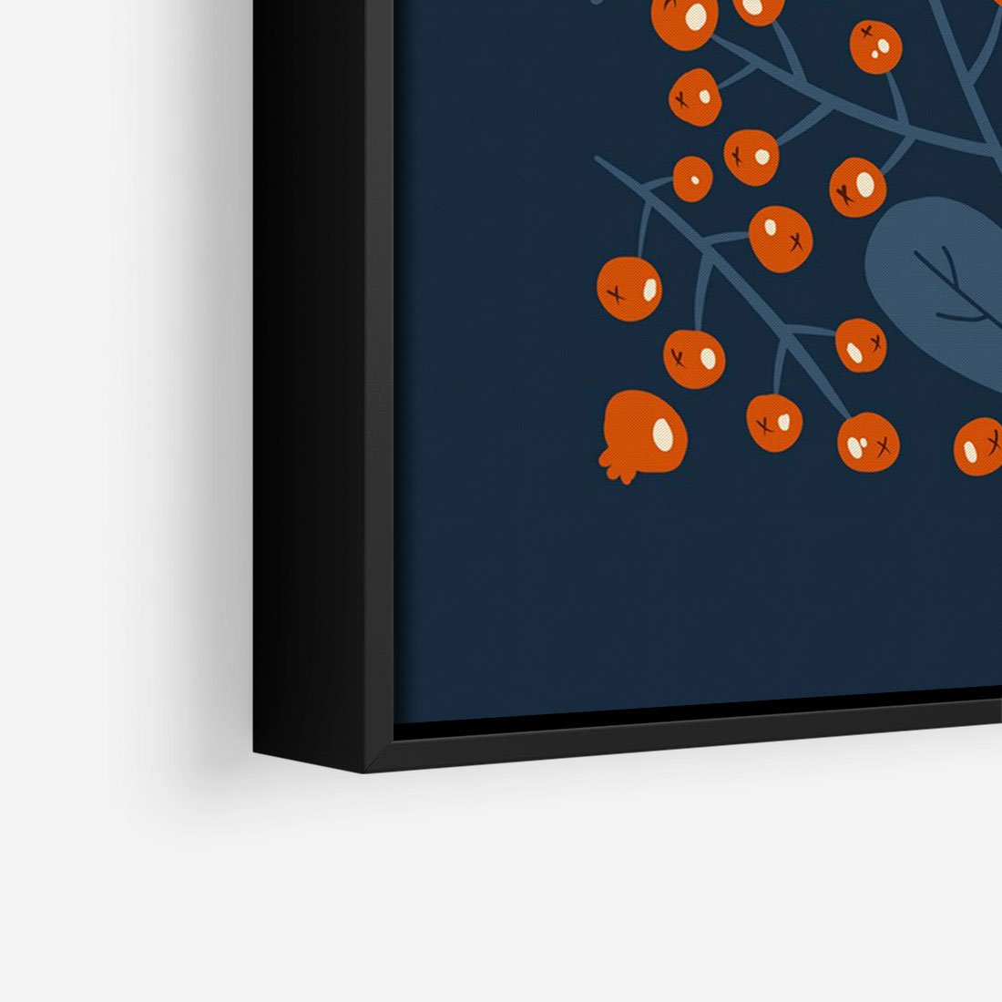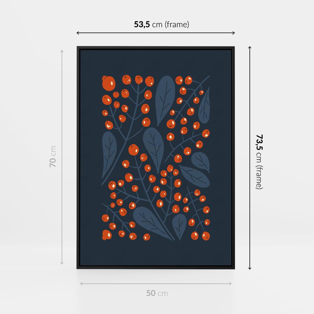 Obraz w ramie 50x70 - Symfonia liści i owoców - granatowe tło, pomarańczowe owoce jarzębiny - rama czarna