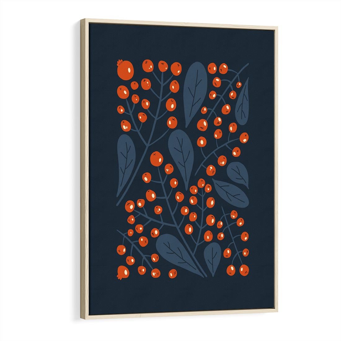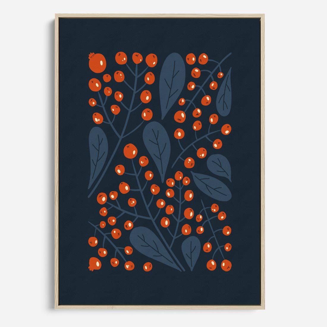 Na granatowym tle wyraziste pomarańczowe owoce jarzębiny tworzą dynamiczną roślinną kompozycję. To harmonijne połączenie barw, które oddaje piękno i zróżnicowanie natury. To obraz, który przykuwa uwagę i wyróżnia się oryginalnym zestawieniem kolorów i form roślinnych.