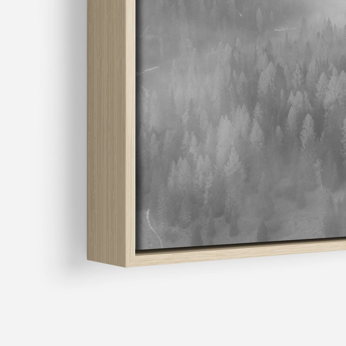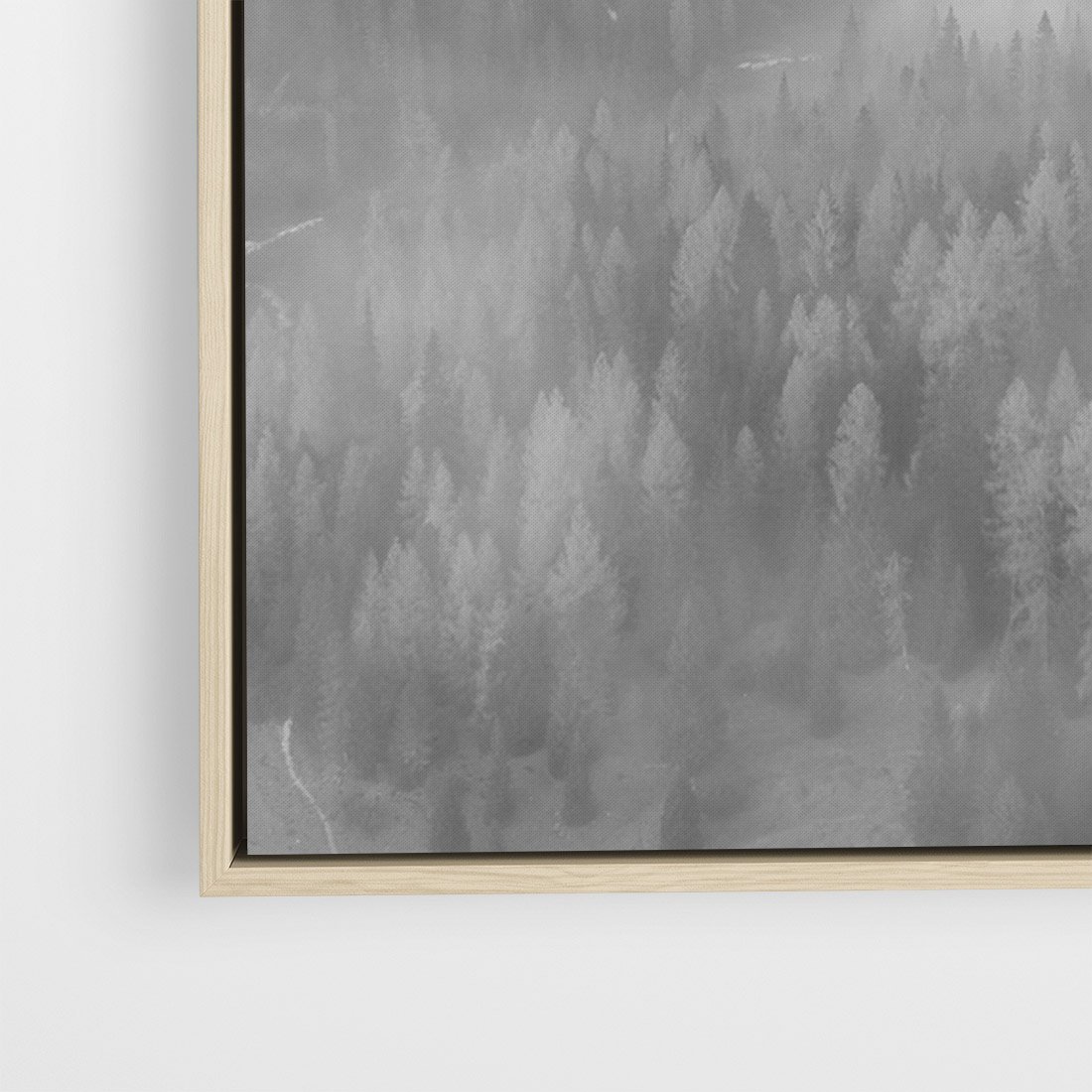 Ten obraz przedstawia uroczy i tajemniczy pejzaż, gdzie zamglone góry i las tworzą malowniczy krajobraz. Odcienie szarości i delikatna mgła nadają kompozycji niepowtarzalny charakter. To dzieło sztuki przeniesie widza w spokojny świat natury, zachęcając do chwili refleksji i kontemplacji. Idealny wybór dla miłośników pejzaży i minimalistycznego piękna.