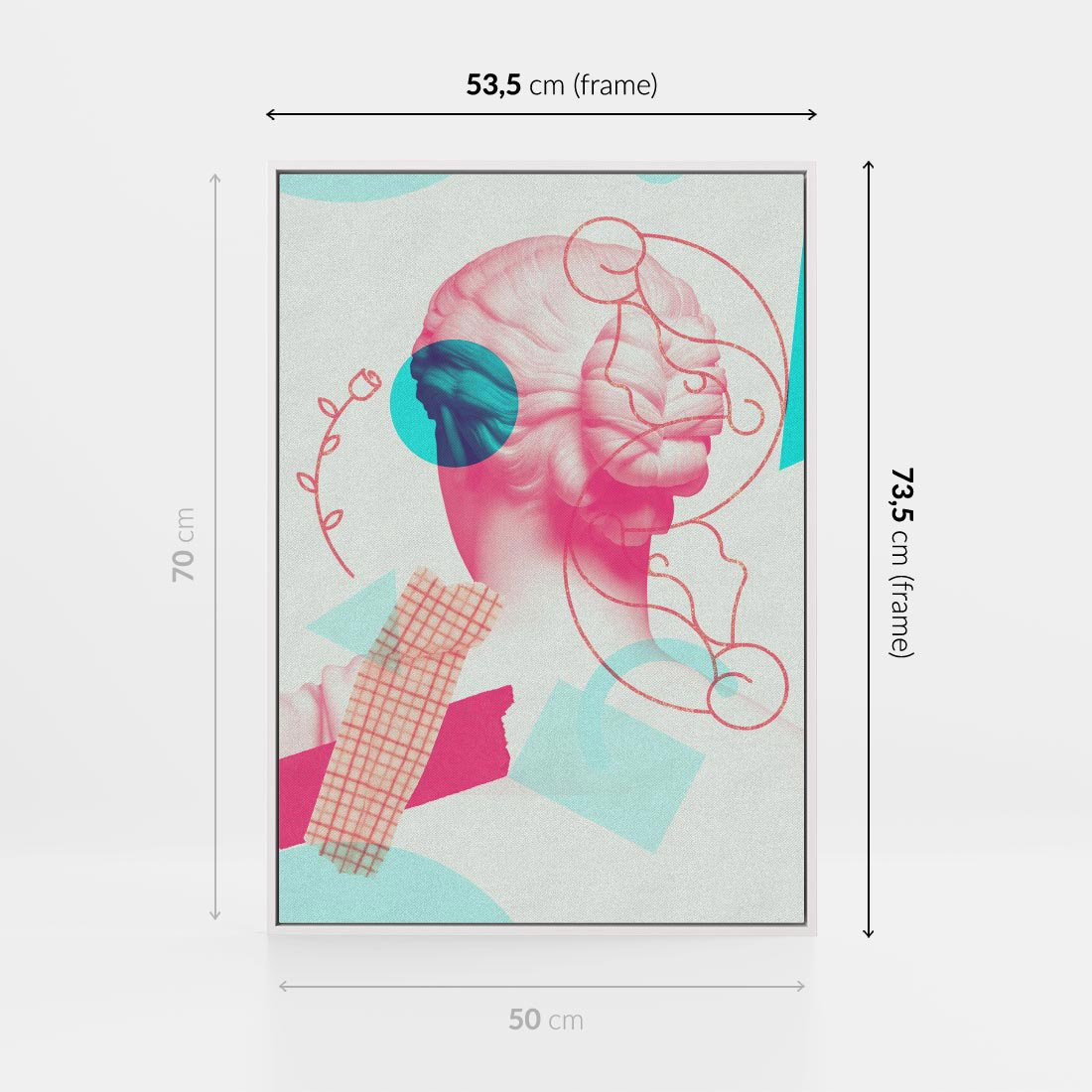 Ten nowoczesny kolaż łączy antyczną rzeźbę kobiety z elementami sztuki współczesnej. W delikatnych odcieniach różowego ukazuje piękno ludzkiej formy, przenosząc je w nowoczesny kontekst. To unikalne dzieło sztuki przyciąga wzrok i inspiruje do refleksji nad pięknem i ewolucją sztuki przez wieki.