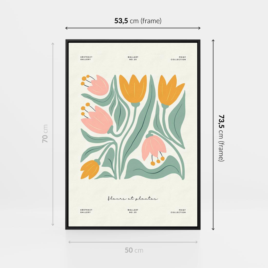 Ten plakat w nowoczesnej abstrakcji przywołuje piękno kwiatów w pastelowych tonach, w harmonii z delikatną typografią. Kompozycja tworzy subtelne i spokojne wrażenie, zachęcając do odkrywania piękna natury.