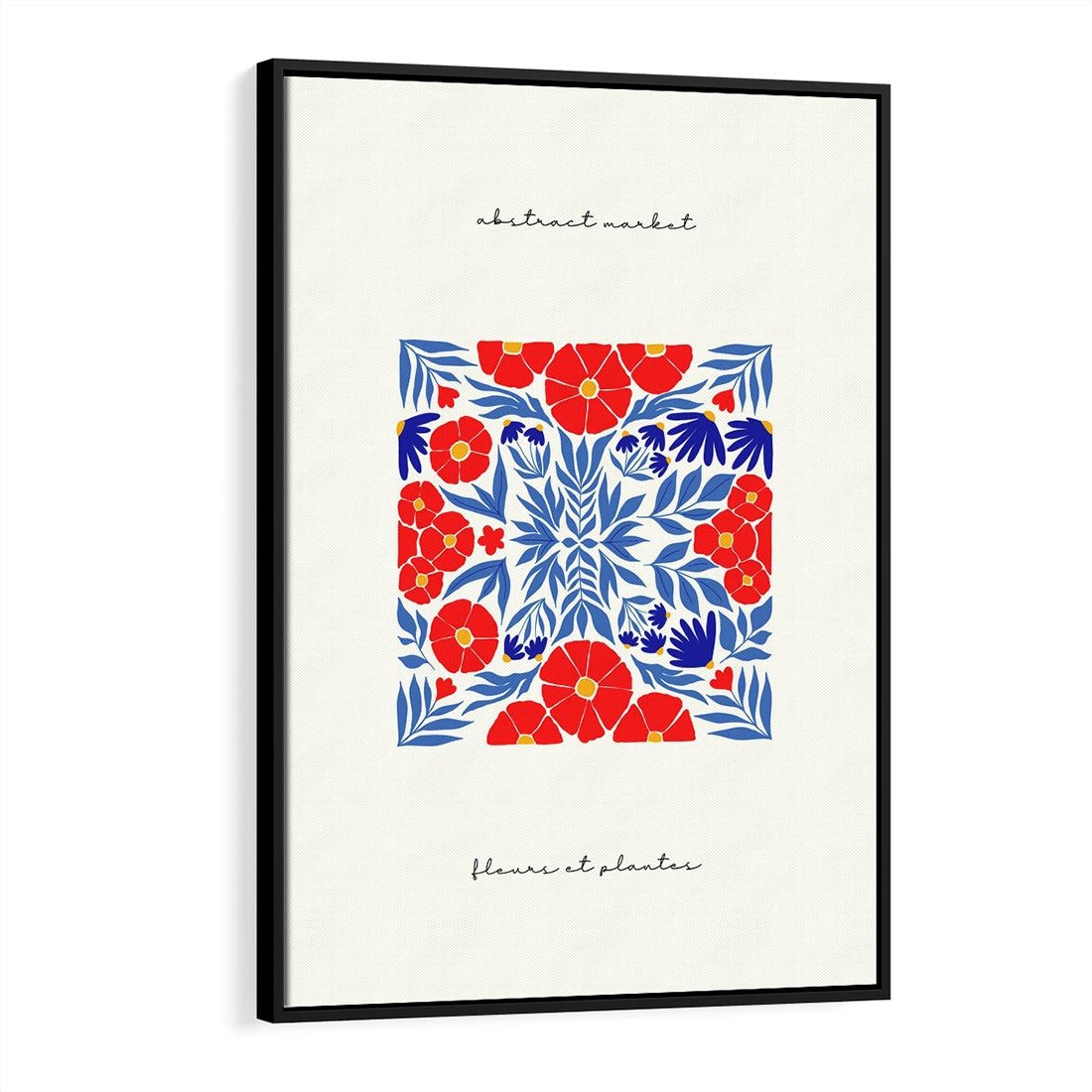 Ta nowoczesna kwiatowa kompozycja łączy odważne odcienie czerwieni i niebieskiego, w harmonii z delikatną typografią. Sztuka ta tworzy dynamiczną i ekspresyjną przestrzeń, łącząc piękno natury z mocą słów.