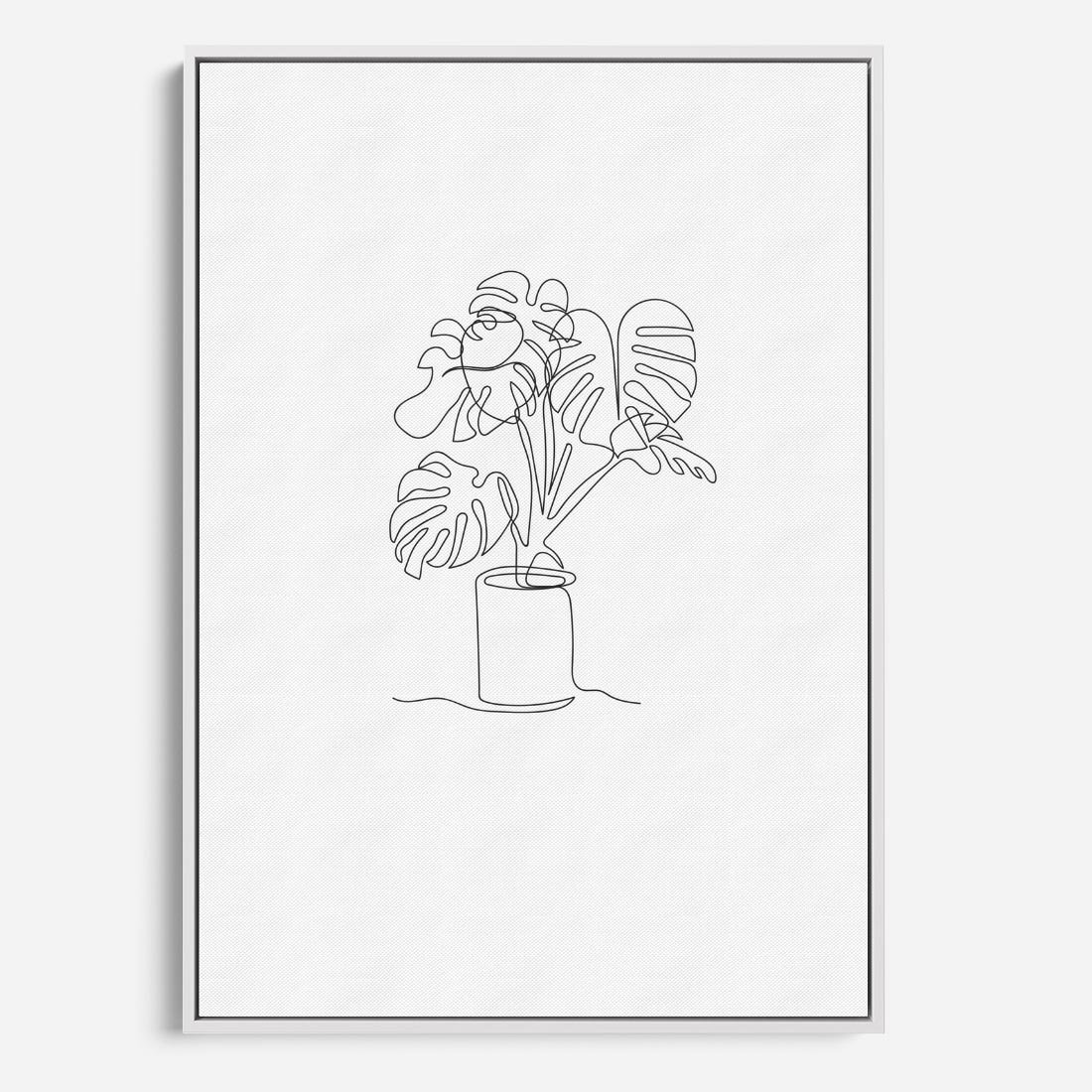 Sztuka w stylu one line przedstawiająca monsterę w doniczce i jej tropikalne liście. Szczegółowy szkic na białym tle przyciąga wzrok swoją prostotą i wyrazistością.