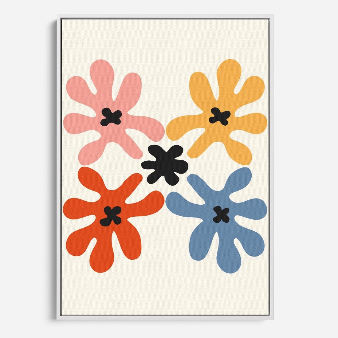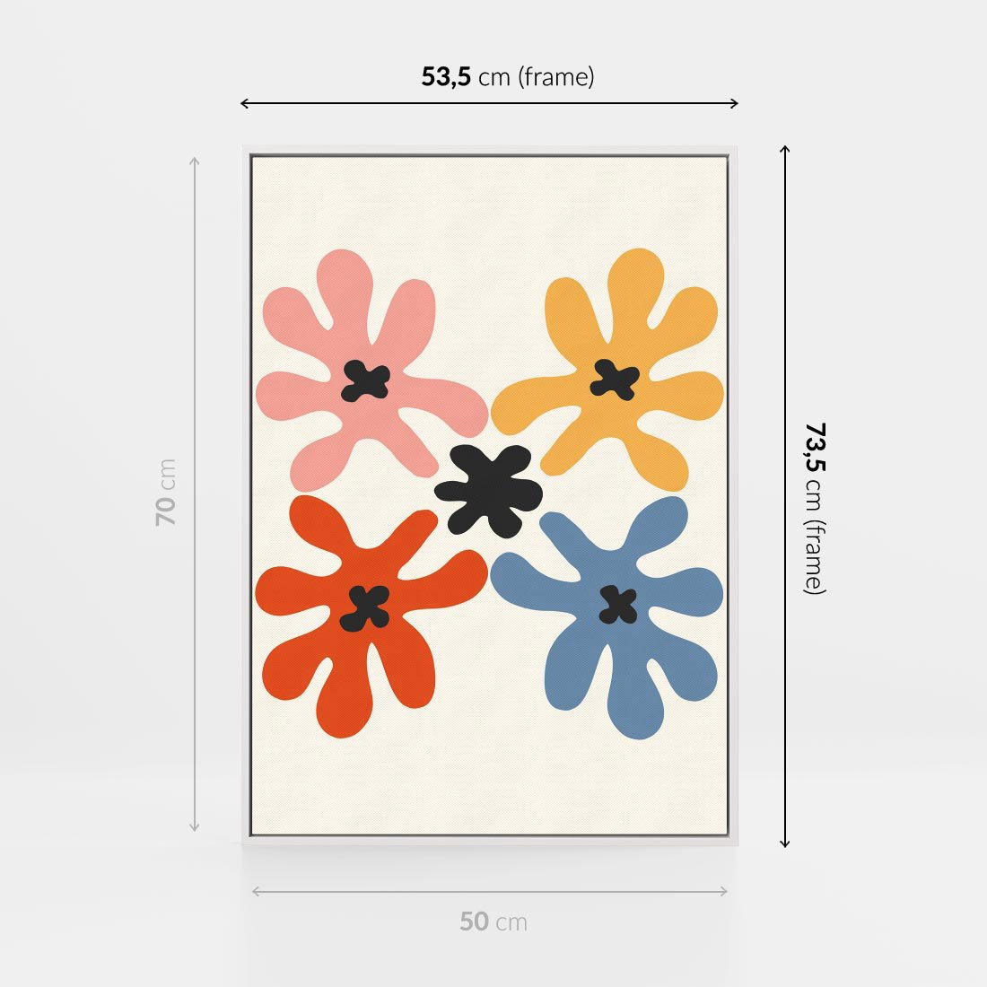 Ten minimalistyczny obraz przedstawia abstrakcyjne wielokolorowe kwiaty o dziwnych, intrygujących formach. Wykorzystując minimalizm, tworzy unikalny efekt wizualny, który ożywi i urozmaici każde wnętrze.