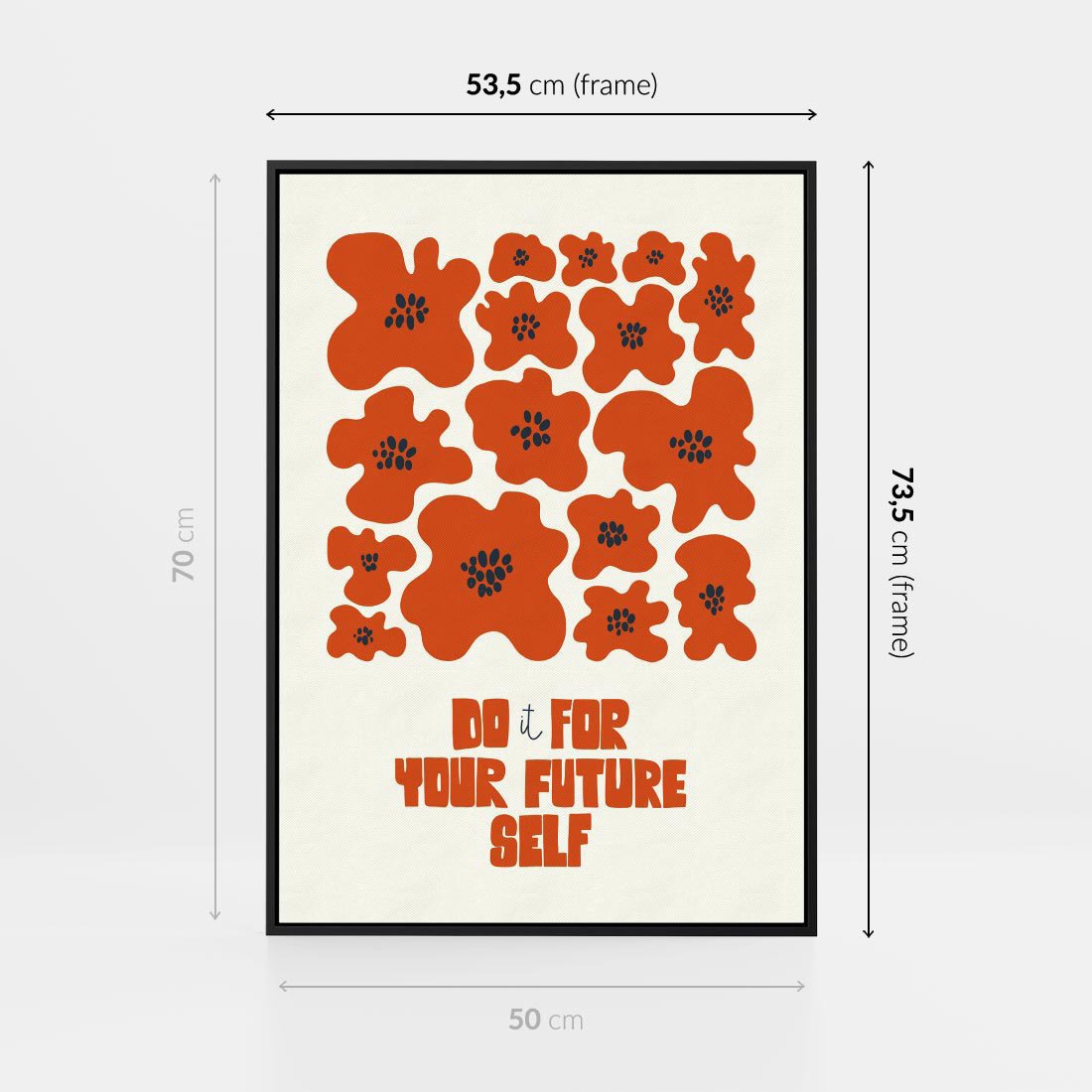 Ta nowoczesna grafika przedstawia kompozycję pomarańczowych kwiatów, która odzwierciedla ideę self-care. To obraz, który przypomina o ważności dbania o siebie, zachęcając do wewnętrznego odprężenia. Połączenie kwiatów z inspirującą typografią tworzy piękny przekaz, wprowadzając do wnętrza dawkę pozytywnej energii.