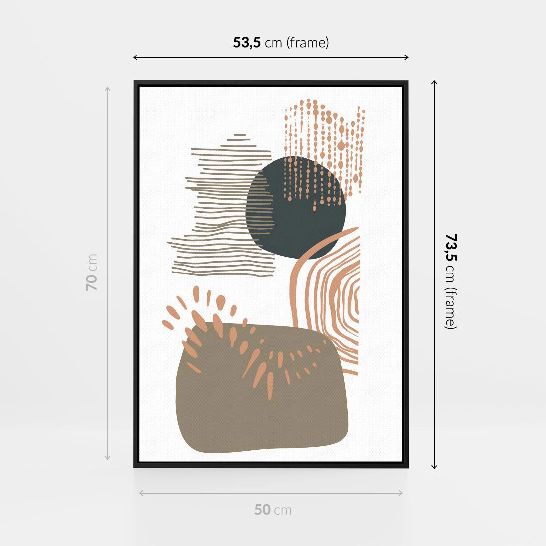 Ta abstrakcyjna kompozycja składa się z delikatnych kropek, kresek i kółek w spokojnych odcieniach brązu i beżu. Jej minimalistyczny charakter przynosi uczucie harmonii i spokoju, doskonale pasując do każdego wnętrza.