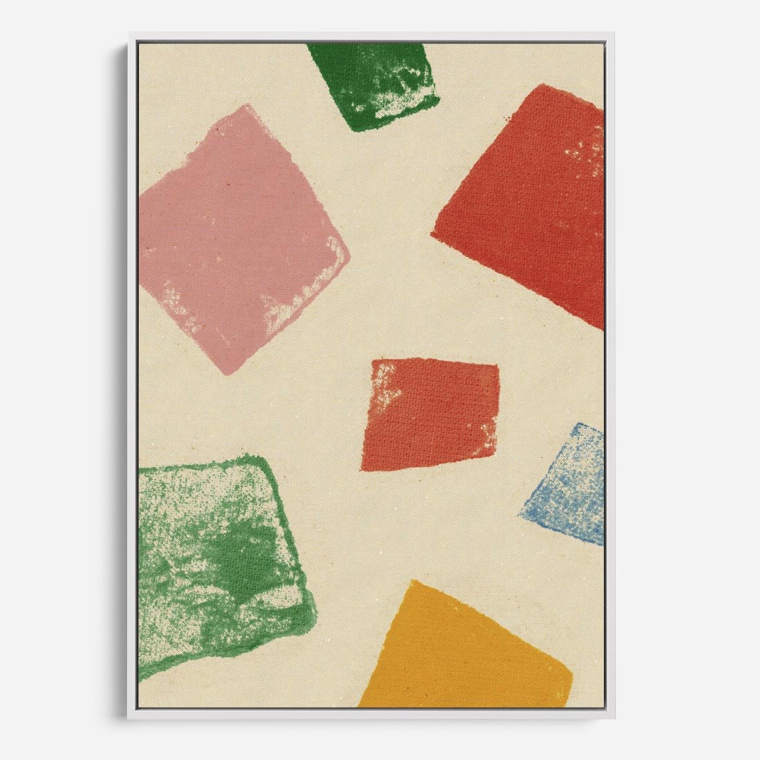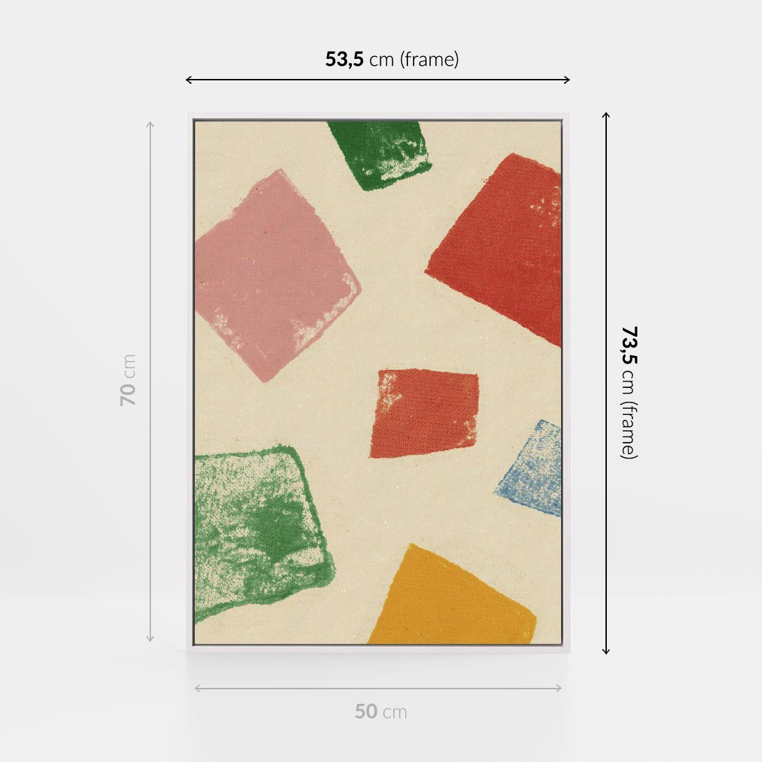 Ten wesoły kolaż to dynamiczna kompozycja kolorowych tęczowych kwadratów, które tworzą energetyczną harmonię. Wyraziste stemple dodają charakteru temu dziełu sztuki, które w pełni emanuje radością i pozytywnym wydźwiękiem.