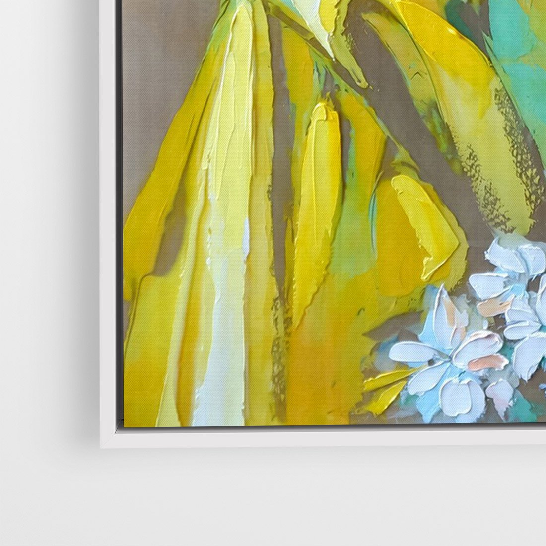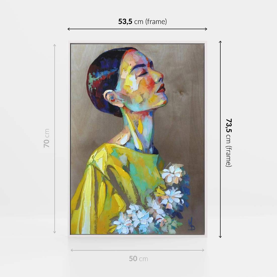Obraz w ramie 50x70 - W Żółtej Sukience - olejny abstrakcyjny obraz, portret kobiety w żółtej sukience - rama biała