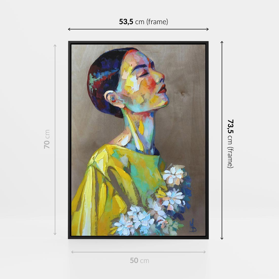 Obraz w ramie 50x70 - W Żółtej Sukience - olejny abstrakcyjny obraz, portret kobiety w żółtej sukience - rama czarna
