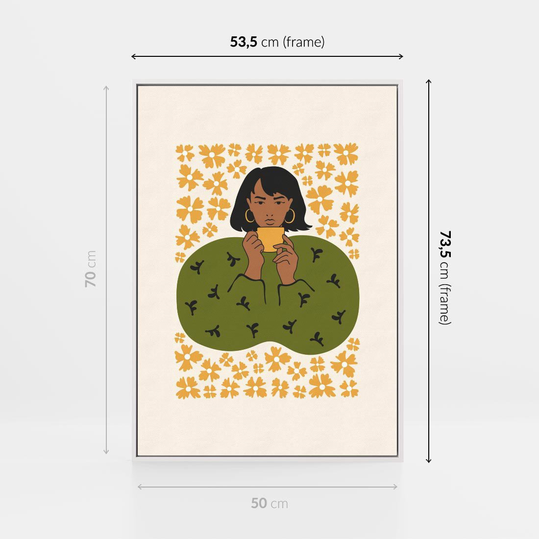 Obraz w ramie 50x70 - Wewnętrzne Fale - nowoczesny plakat, kobieta otoczona liśćmi - rama biała