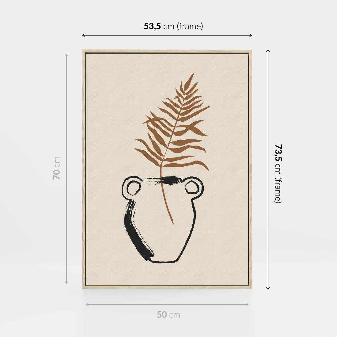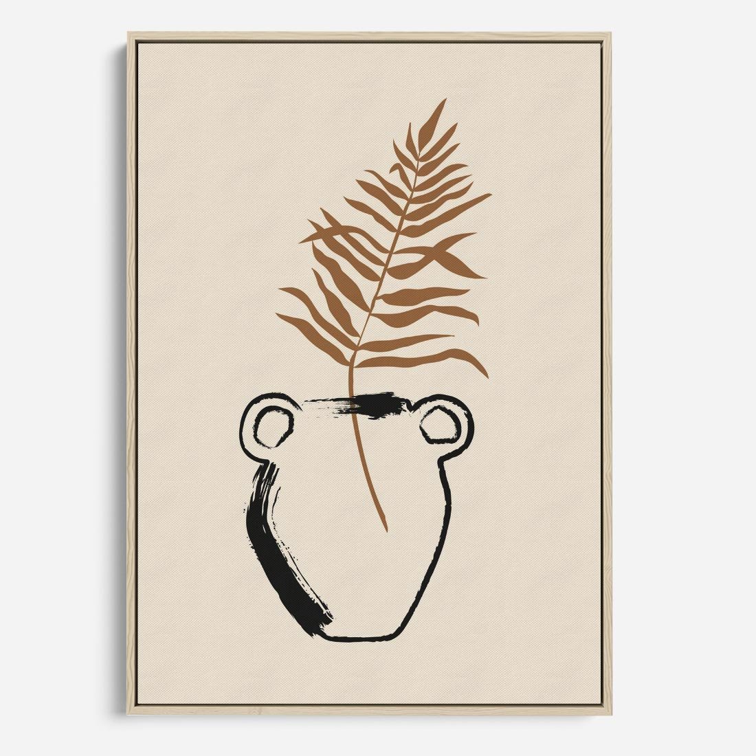 Ten plakat łączy ducha boho z nowoczesną sztuką, prezentując antyczny wazon z delikatnie umieszczoną palmą w minimalistycznym otoczeniu. Sztuka ta tworzy wyjątkową równowagę pomiędzy różnymi stylami, wprowadzając do Twojej przestrzeni artystyczny akcent, który jednocześnie ożywia i uspokaja, oddając esencję piękna natury i estetyki.