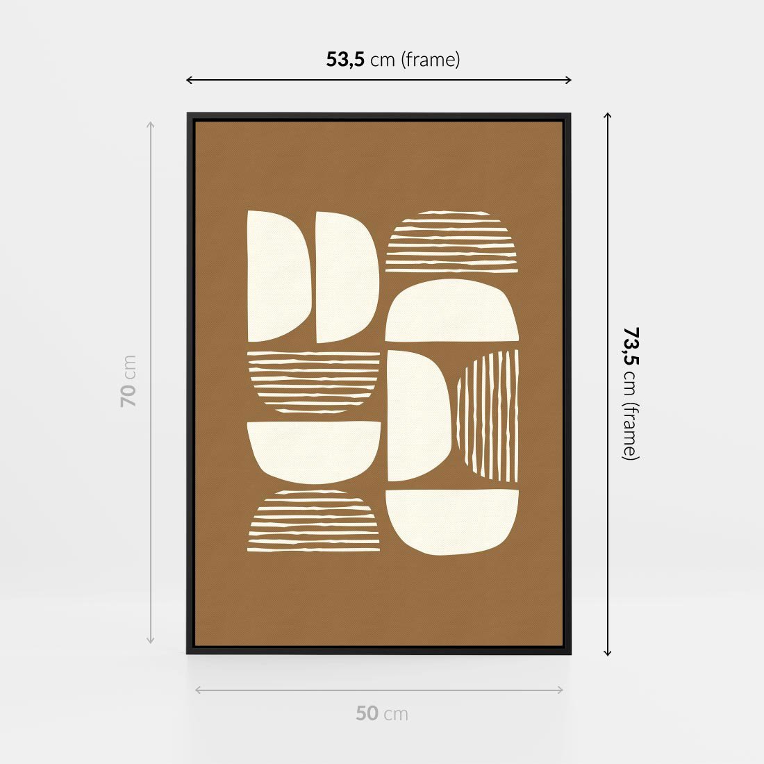 Ten plakat łączy geometryczne boho kształty z minimalistycznym podejściem, prezentując je na ciepłym brązowym, karmelowym tle. Sztuka ta tworzy harmonijną równowagę między różnymi stylami, wprowadzając do Twojej przestrzeni elegancki akcent, który emanuje spokojem i estetyką, doskonale wpisując się w minimalistyczne wnętrza.