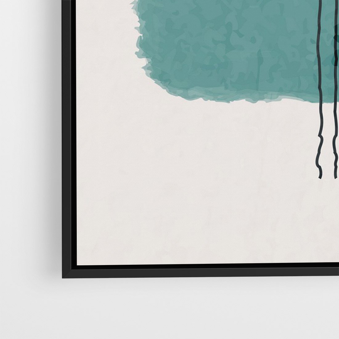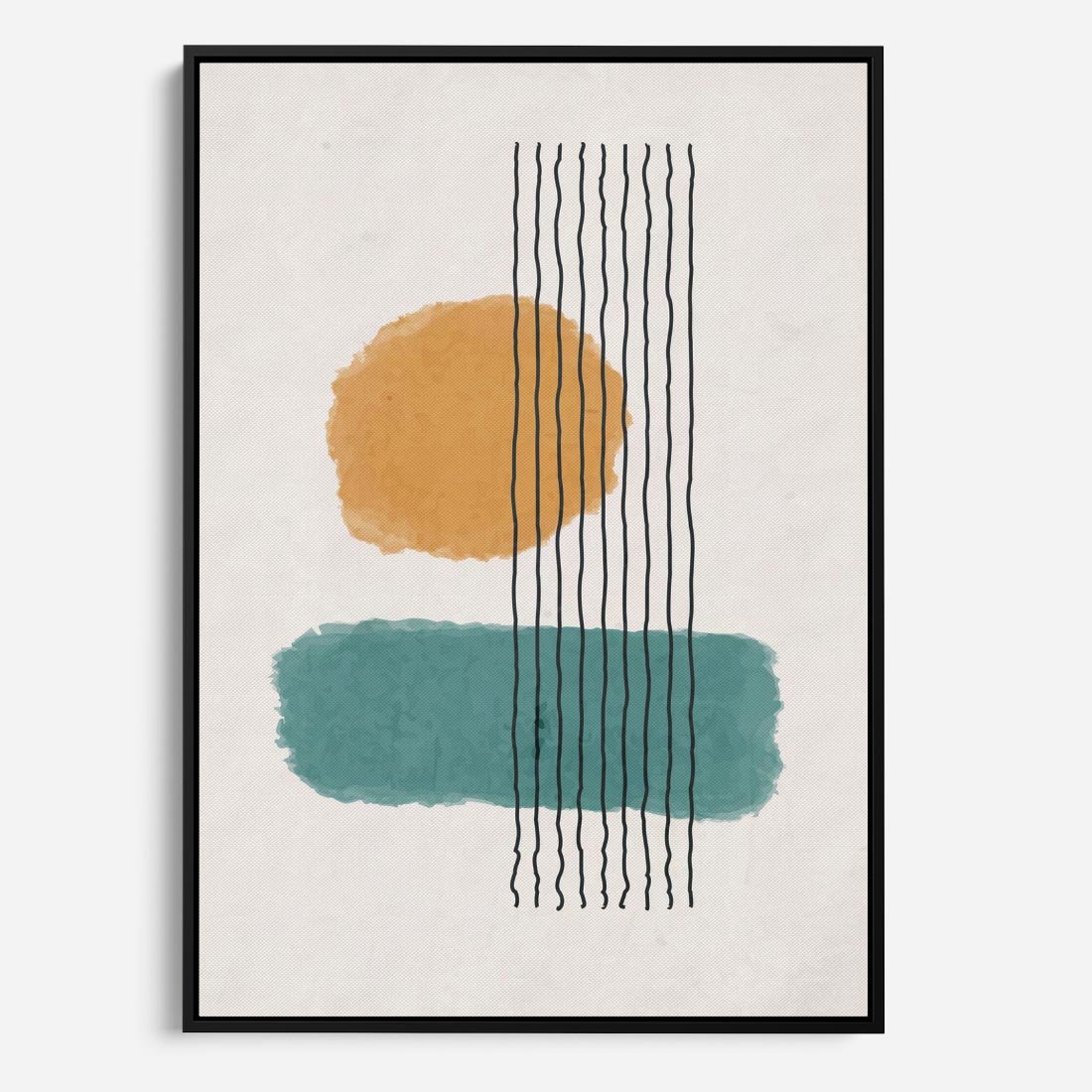 Twórczy plakat przedstawia abstrakcyjne akwarelowe plamy w odważnych odcieniach turkusu i żółtego, zdobiące się nieregularnymi kreskami i dynamicznymi liniami. Minimalizm w nowoczesnej sztuce.