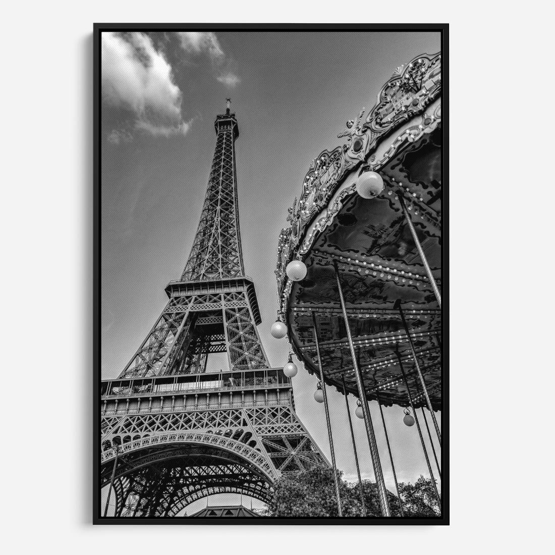 To czarno-białe zdjęcie przedstawia Wieżę Eiffla w Paryżu w towarzystwie urokliwej karuzeli. To ikoniczna scena z francuskiej stolicy, która łączy w sobie zarówno nowoczesność symbolizowaną przez wieżę, jak i klasyczną, nostalgiczną atmosferę karuzeli. To zdjęcie przenosi nas do magicznego świata Paryża, gdzie historia i nowoczesność spotykają się w niezwykły sposób. Jest to doskonała dekoracja dla tych, którzy pragną poczuć magię tego pięknego miasta.