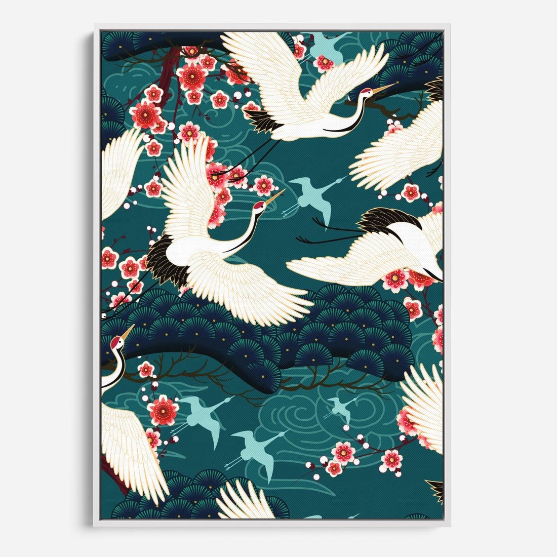 Obraz w ramie 50x70 - Żurawie Wachlarze - orientalne japońskie żurawie, grafika - rama biała