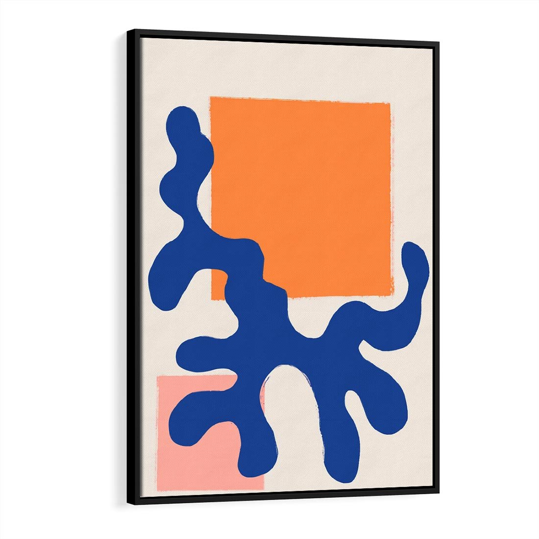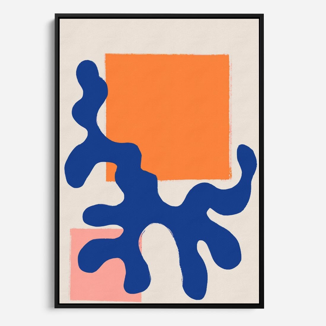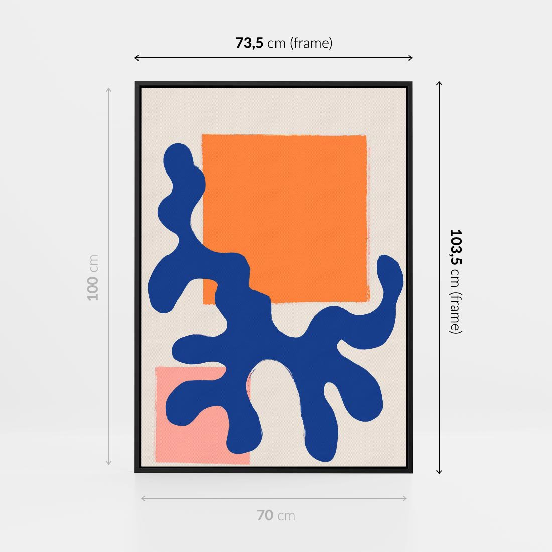 Ten nowoczesny plakat prezentuje abstrakcyjne geometryczne kształty w intensywnych kolorach pomarańczowym i granatowym. To dzieło sztuki wnosi do Twojej przestrzeni nowoczesny charakter i ekspresyjność. Idealny wybór dla tych, którzy cenią sobie sztukę abstrakcyjną i dynamiczne kompozycje kolorystyczne.
