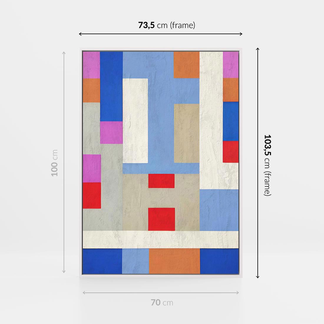 Ten olejny obraz to prawdziwa uczta dla oczu, gdzie abstrakcyjne geometryczne kształty składają się w harmonijną kompozycję. Delikatne pastelowe kolory nadają mu subtelności i spokoju, tworząc unikalny kontrast z wyrazistymi prostokątami i kwadratami. To dzieło sztuki doskonale wpisujące się w nowoczesne wnętrza, które zachwyci zarówno miłośników abstrakcji, jak i estetyki geometrycznych form.