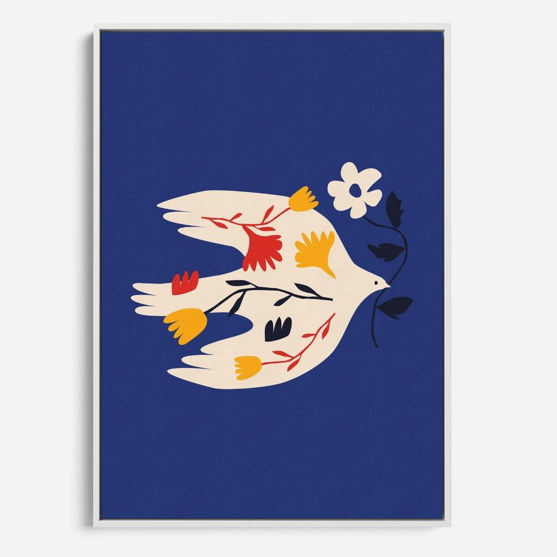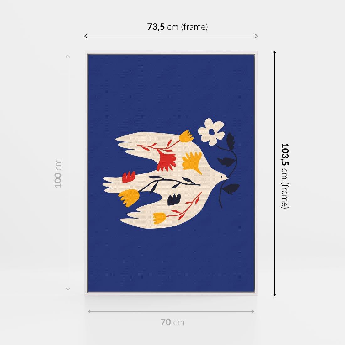 Ten nowoczesny plakat przedstawia abstrakcyjnego, białego ptaka wśród delikatnych kwiatów na spokojnym niebieskim tle. Sztuka ta oddaje subtelność natury i tworzy przestrzeń refleksji oraz spokoju, będąc jednocześnie wyrazem nowoczesnej estetyki.