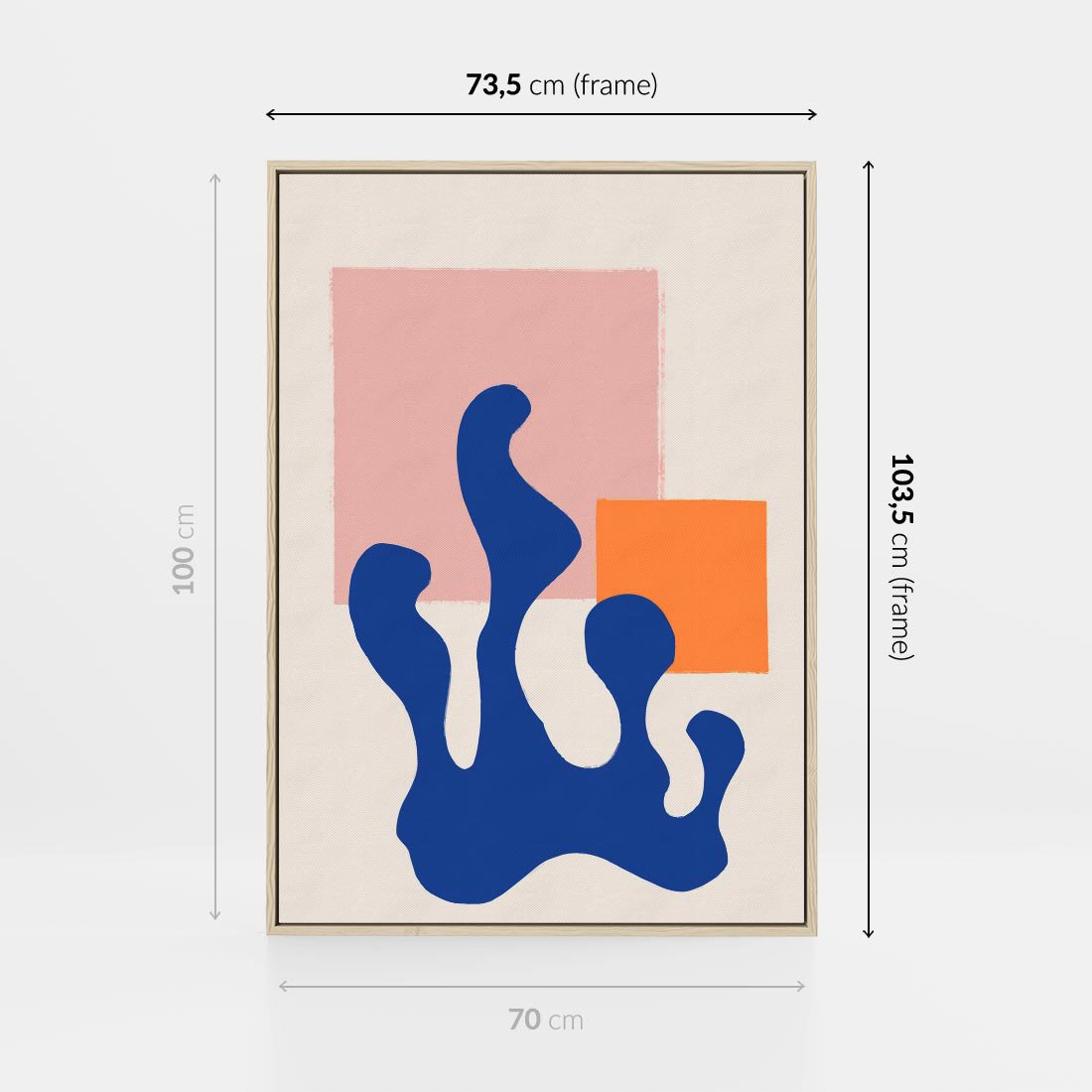 Ten nowoczesny plakat jest prawdziwym dziełem abstrakcyjnej sztuki, w którym dominują geometryczne kształty w intensywnych kolorach: pomarańczowym i granatowym. To dzieło łączy w sobie nowoczesność z abstrakcją, tworząc efektowną i energetyczną kompozycję. Idealny wybór dla miłośników sztuki nowoczesnej i wyrazistych wzorów.