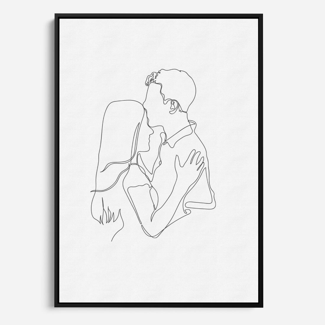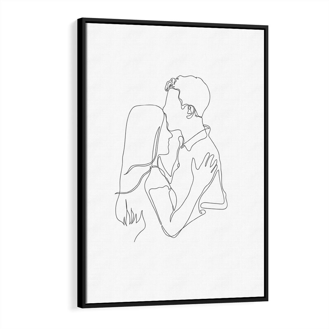 Delikatny szkic przedstawiający parę zakochanych - kobietę i mężczyznę, narysowaną jedną ciągłą linią. Sztuka oddaje piękno prostoty i miłości.
