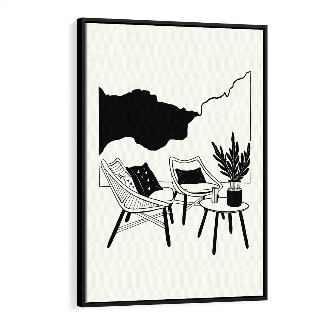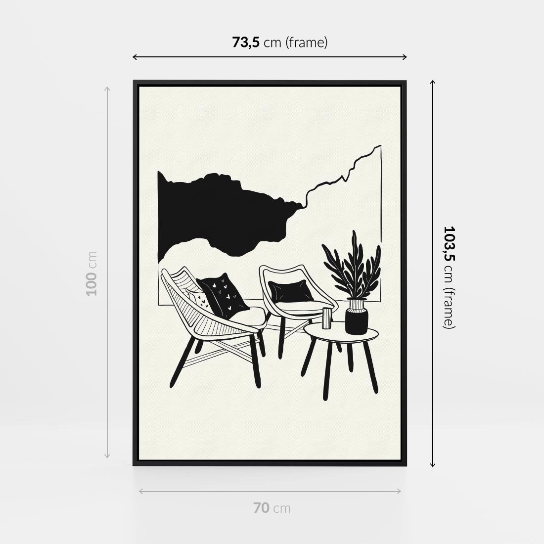 Ten biało-czarny rysunek doskonale wpisuje się w boho wnętrze salonu, łącząc nowoczesną sztukę z duchem swobodnego stylu. Kreuje on harmonijną atmosferę, dodając salonowi wyjątkowy urok.