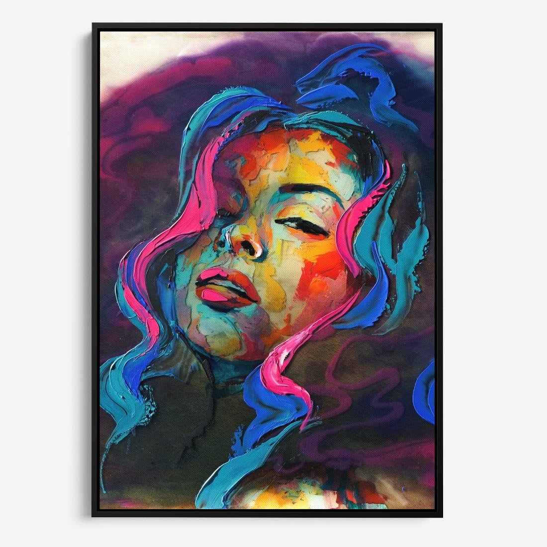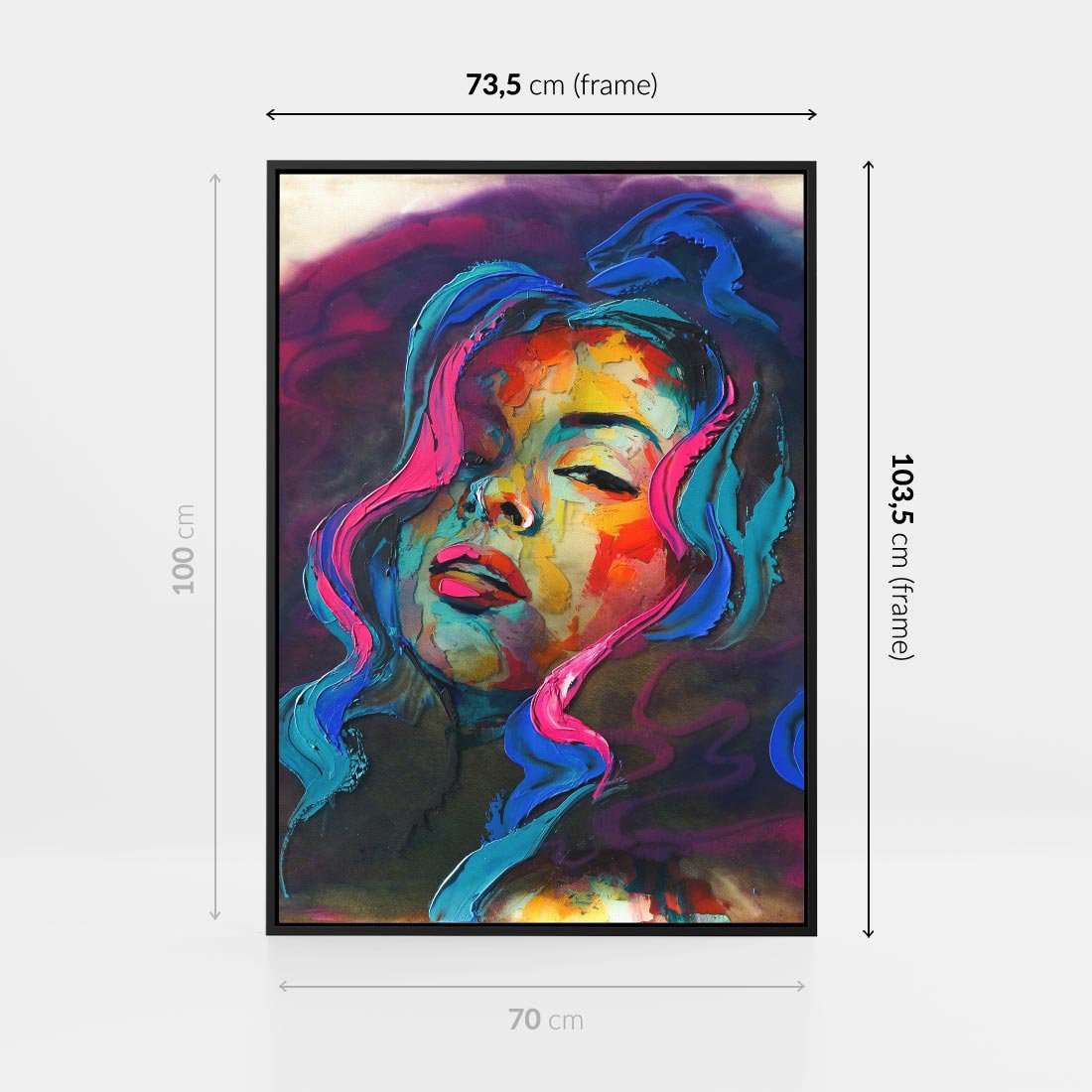 Ta dynamiczna grafika komputerowa odbiega od tradycyjnych portretów i prezentuje abstrakcyjną formę kobiety z bujnymi, intensywnie kolorowymi włosami. Wizualna siła obrazu przypomina olejne malarstwo, co nadaje mu wyjątkowego uroku. To niezwykłe dzieło sztuki pomoże ożywić przestrzeń i przyciągnie uwagę miłośników zarówno sztuki tradycyjnej, jak i współczesnej.