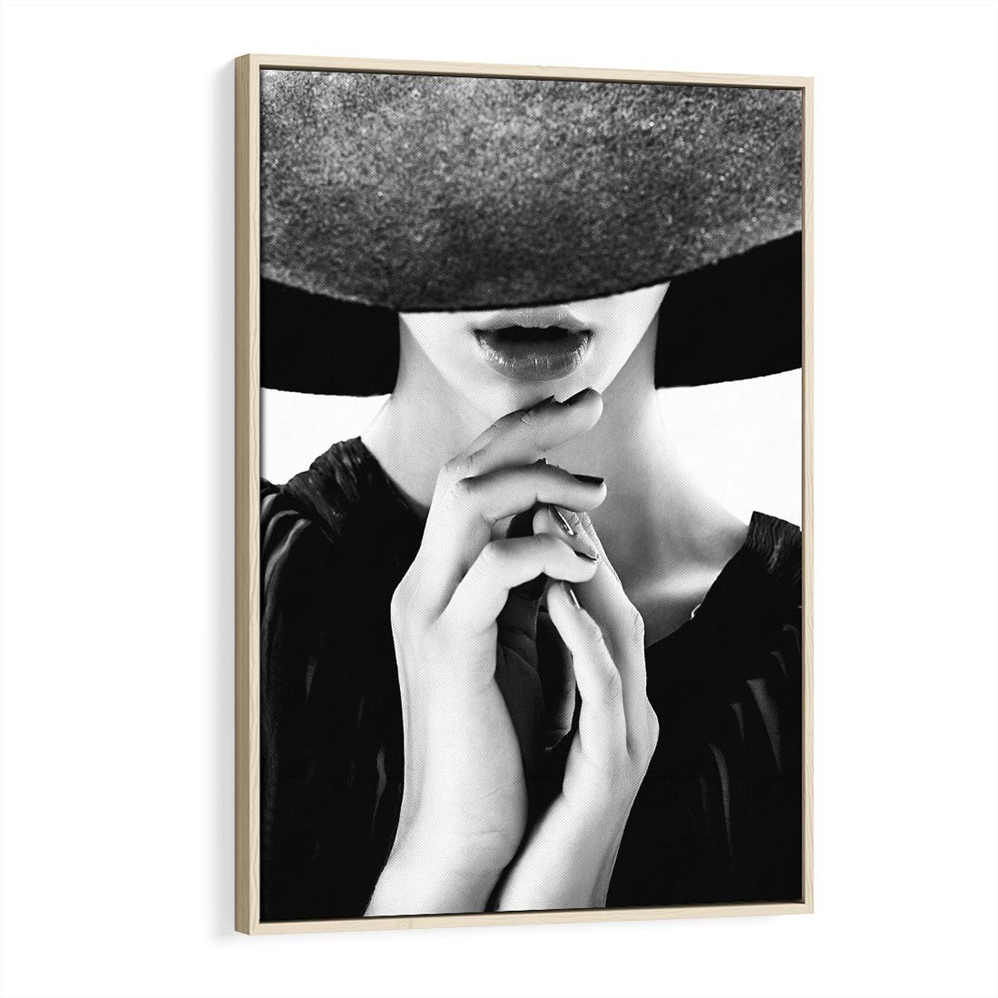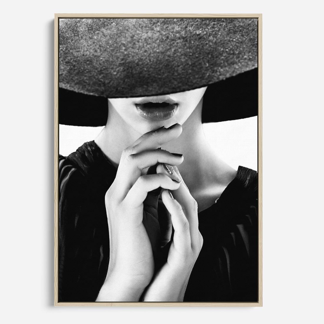 Ta czarno-biała fotografia przedstawia portret tajemniczej kobiety w czerni. Jej duży kapelusz zasłania oczy, dodając enigmatycznego charakteru. Kompozycja ukazuje niepowtarzalną elegancję, która emanuje z tego misterialnego wizerunku. To wyrafinowane dzieło sztuki, które podkreśla modową i stylową stronę tej tajemniczej postaci.