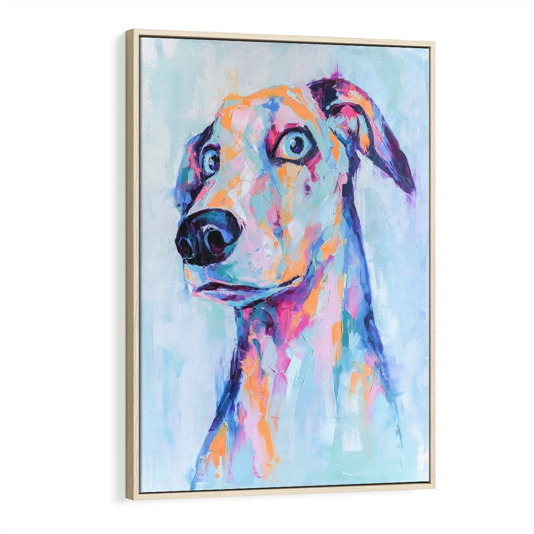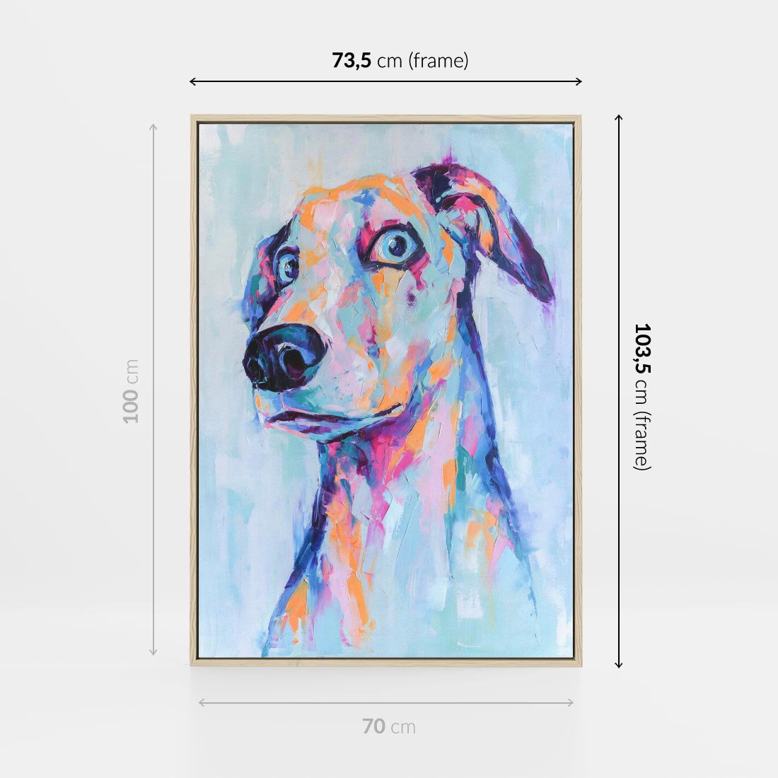Ten olejny obraz to nie tylko portret psa, ale także zabawna i nowoczesna sztuka, która wykorzystuje pastelowe kolory, aby przekazać radość i humor. W centrum obrazu znajduje się portret uroczego psa. Pastelowe kolory nadają obrazowi lekkości i przyjemności. To dzieło sztuki doskonale pasuje do wnętrz, gdzie doceniane są zarówno nowoczesność, jak i poczucie humoru, a także jest znakomitą dekoracją dla miłośników psów.